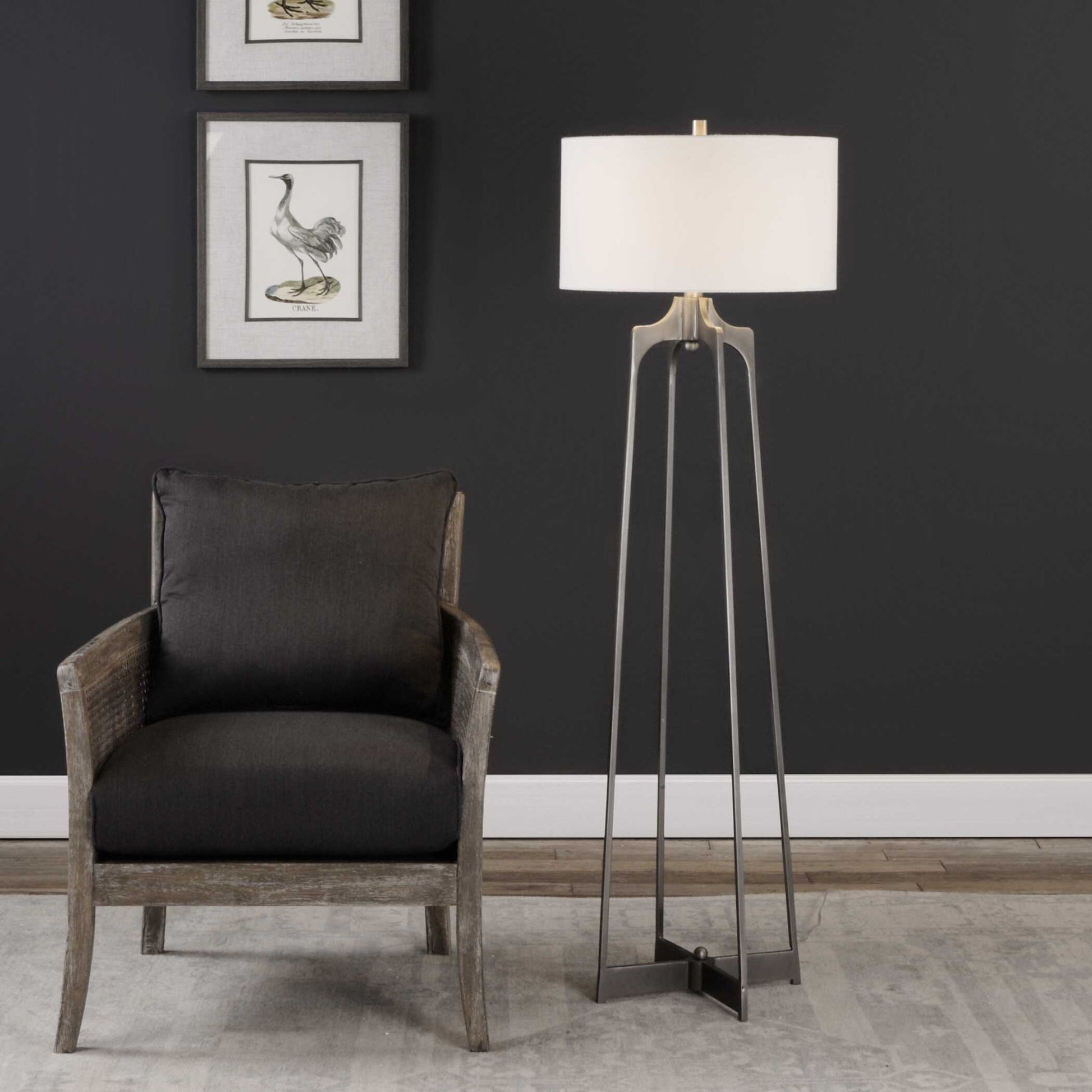 Sleek And Refined, This Lamp Is Constructed Of Forged Steel, Finished In A Plated Aged Gun Metal. The Round Hardback Drum Shade Is A White Linen Fabric With Natural Slubbing.