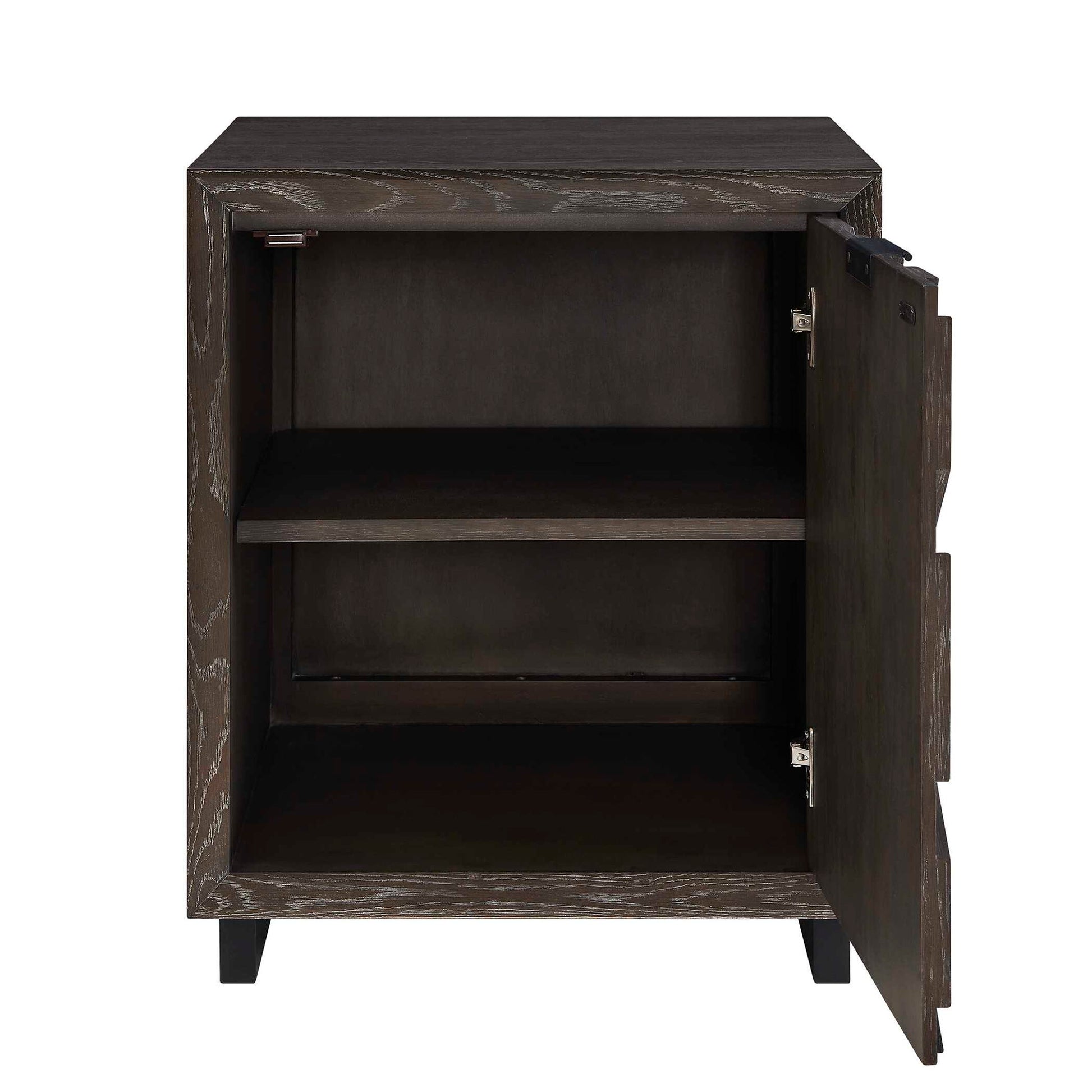 This Stylish One-door Cabinet Features A Dark Charcoal Oak Veneer With A Striking Chevron Wood Grain Pattern On The Front. It Is Supported By Sleek Black Iron Legs And A Matching Door Pull.