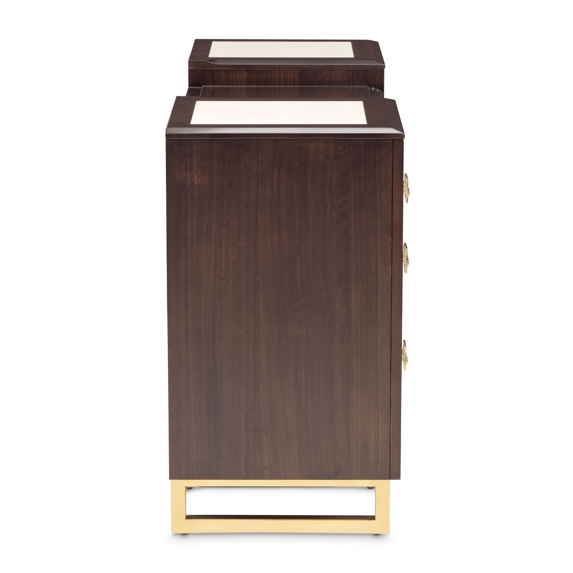 Exuding refined glamour, the Belmont Place Vanity Desk pairs bold contrast with sophisticated craftsmanship. Its rich espresso eucalyptus veneer creates a deep, lustrous frame, while the white anigre drawer fronts and inlaid panels offer a striking visual balance. A sleek glass center top adds a contemporary polish, perfectly complementing the warm glow of the Japan Gold alloy base and hardware. With seven velvet-lined drawers, this versatile silhouette transitions effortlessly from an elegant vanity to a chic writing desk, making it as functional as it is beautiful.