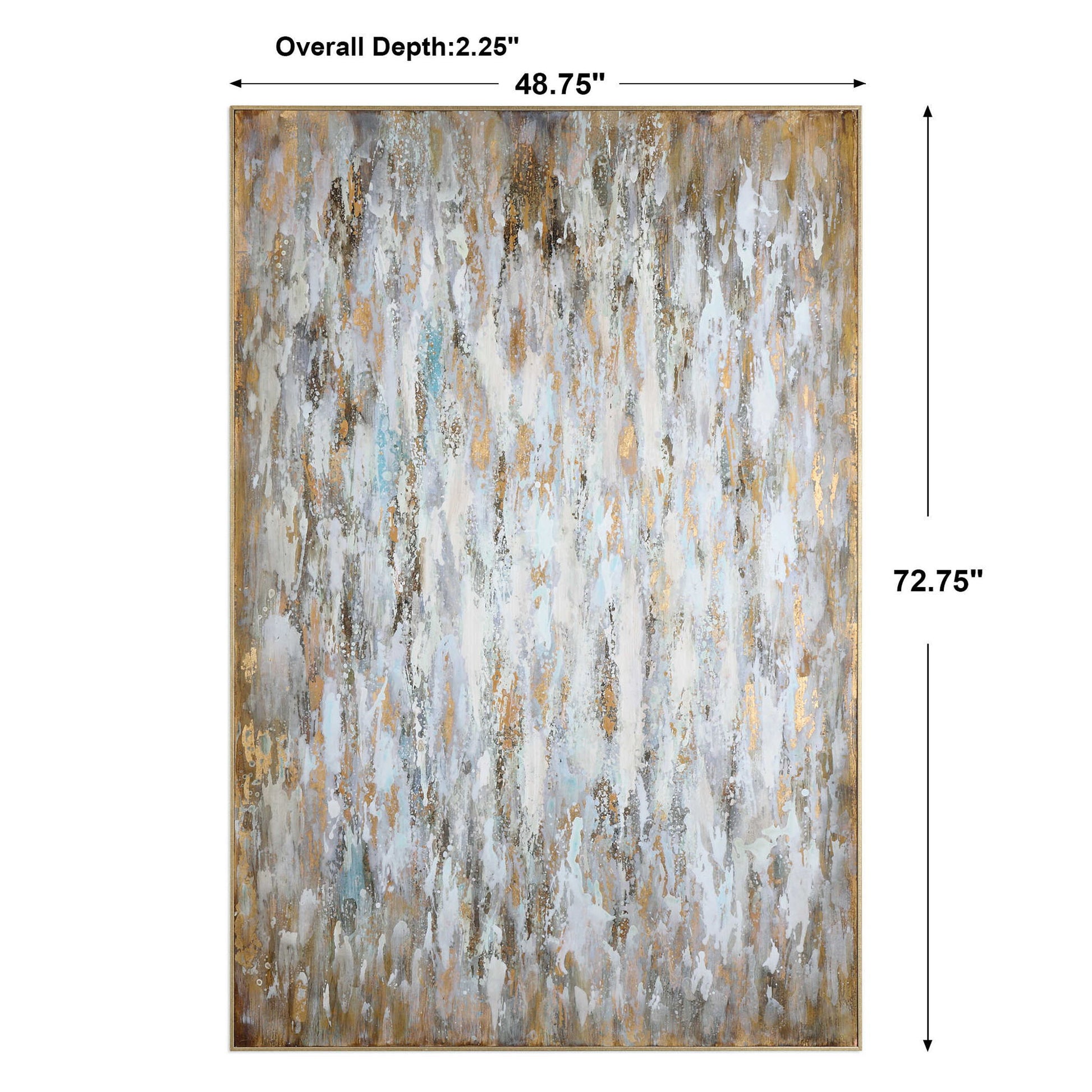 Sophisticated In Style, This Hand Painted Abstract On Canvas Completes Any Contemporary Or Modern Space. Shades Of White, Blue And Bronze Are Accented By Metallic Gold Leaf Details That Create A Stunning Work Of Art. The Canvas Is Stretched And Attached To A Wooden Frame. A Petite, Gold Leaf Gallery Frame Encases Each Piece. Due To The Handcrafted Nature Of This Artwork, Each Piece May Have Subtle Differences. This Piece May Be Hung Horizontal Or Vertical.