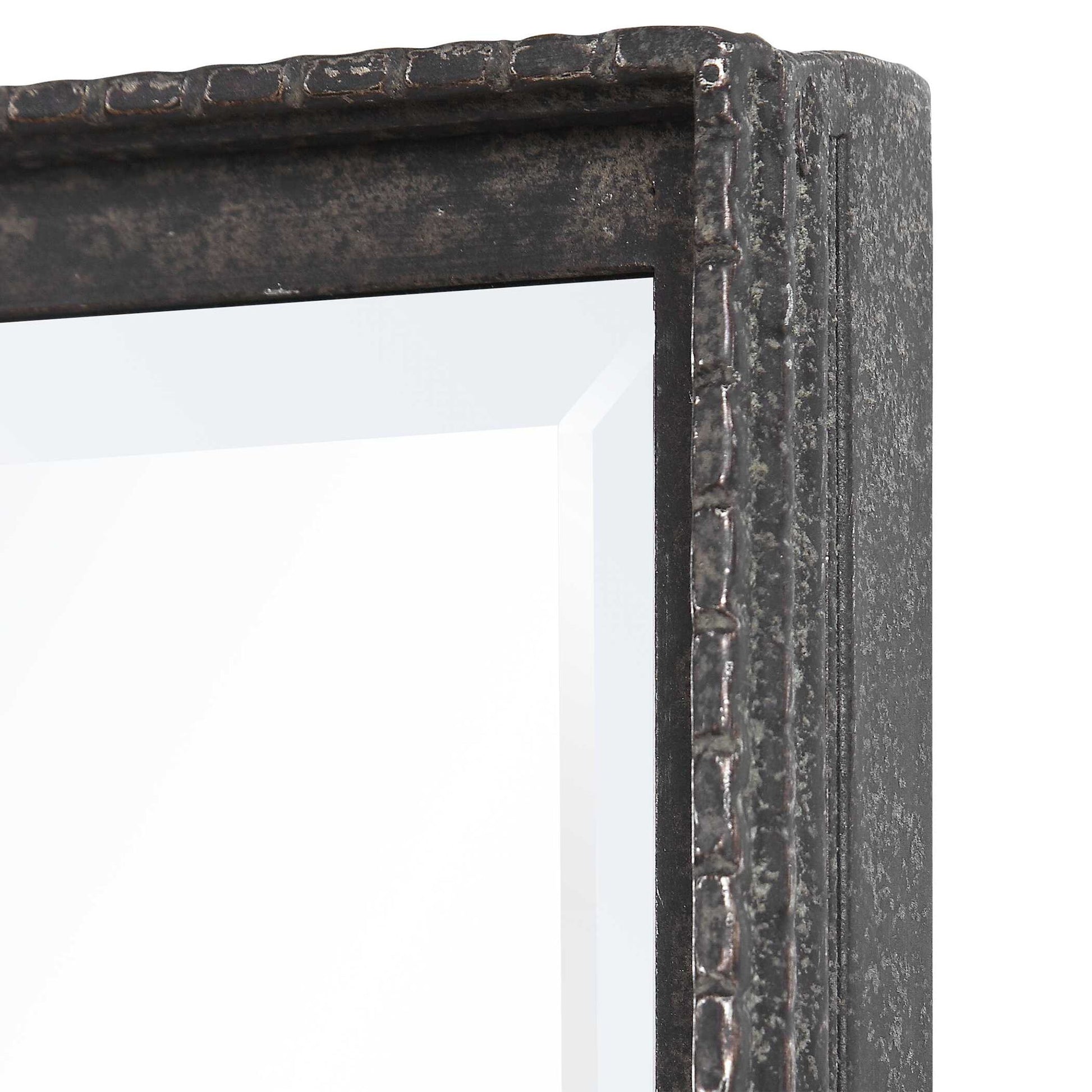 This Simple Vanity Mirror Features An Iron Construction With Detailed Edges. The Slight Profile Frame Is Finished In A Distressed Rustic Black With Aged Champagne Highlights. May Be Hung Horizontal Or Vertical.