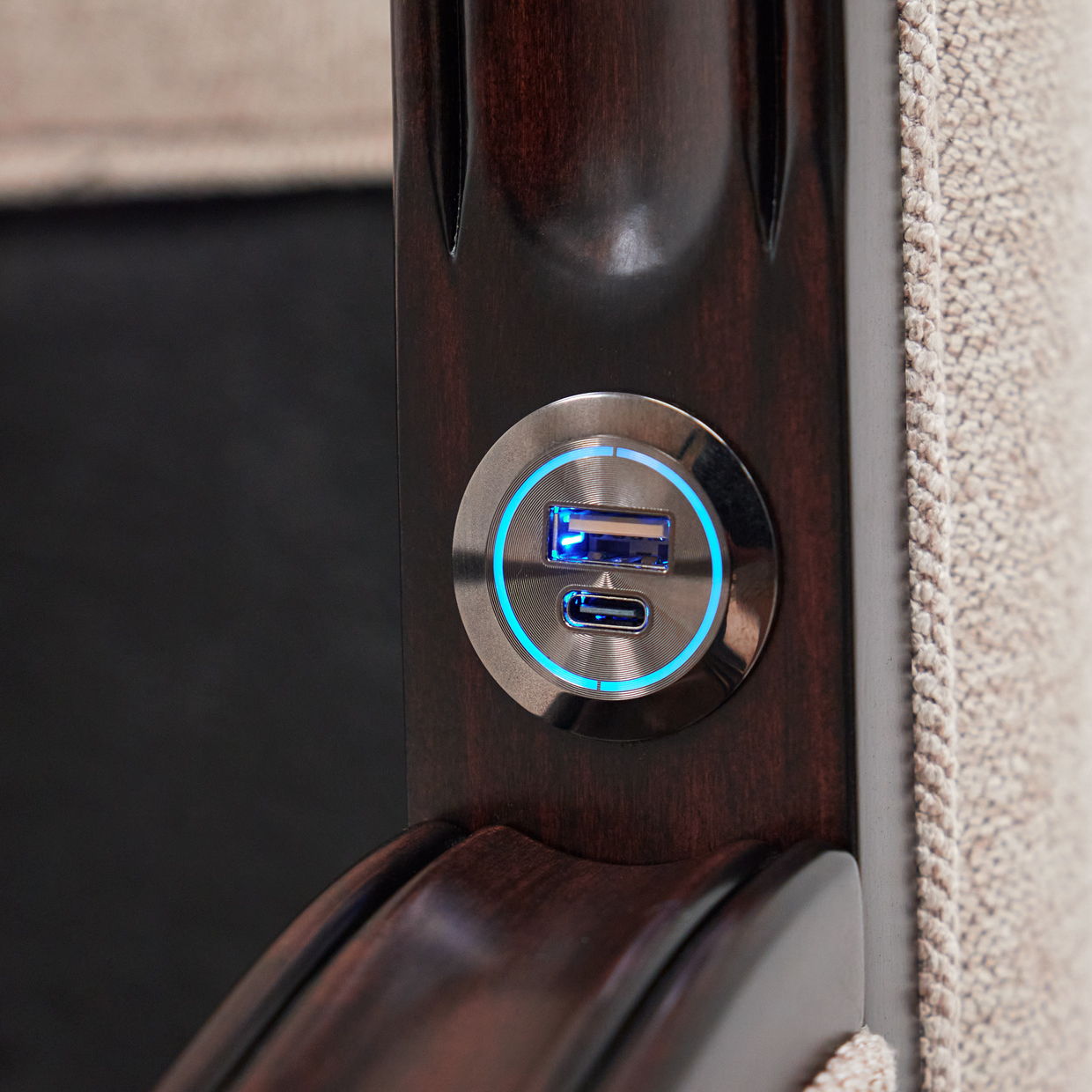 Transform your bedroom into a sanctuary with this exquisitely designed bed. The graceful curves of the headboard and footboard are framed by a warm walnut finish, creating a sense of refined charm. Upholstered panels in a luxurious chenille fabric provide softness and texture, while built-in USB ports add modern functionality. Tapered legs with gold accents complete the look with a subtle touch of luxury. A timeless centerpiece for any serene retreat.