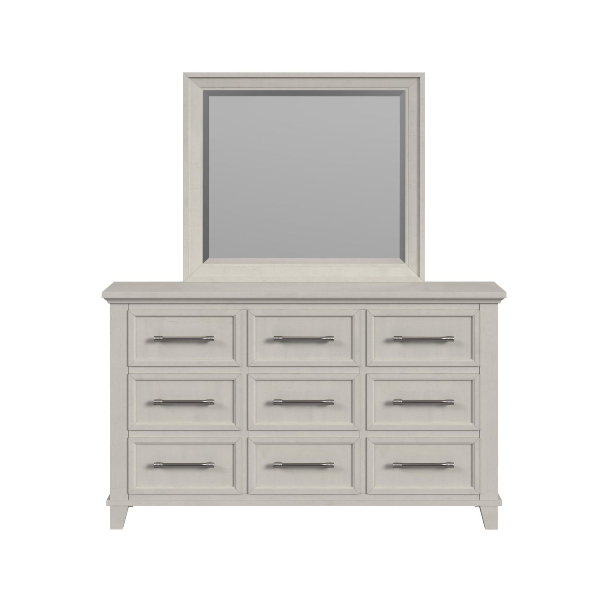 The Canterbury Dresser and Mirror Set exudes timeless elegance with its sleek smooth finish on rich veneer, blending modern and classic design. The ball bearing drawer glides ensure smooth, quiet operation, while refined brushed nickel handles add sophistication. Stylish inset panel fronts and sophisticated beveled edges enhance visual appeal, making this set a stunning focal point in any bedroom. The graceful beveled mirror completes the ensemble, adding charm and functionality. The Canterbury Dresser and Mirror Set perfectly combines functionality and elegance, bringing style and luxury to your living space.