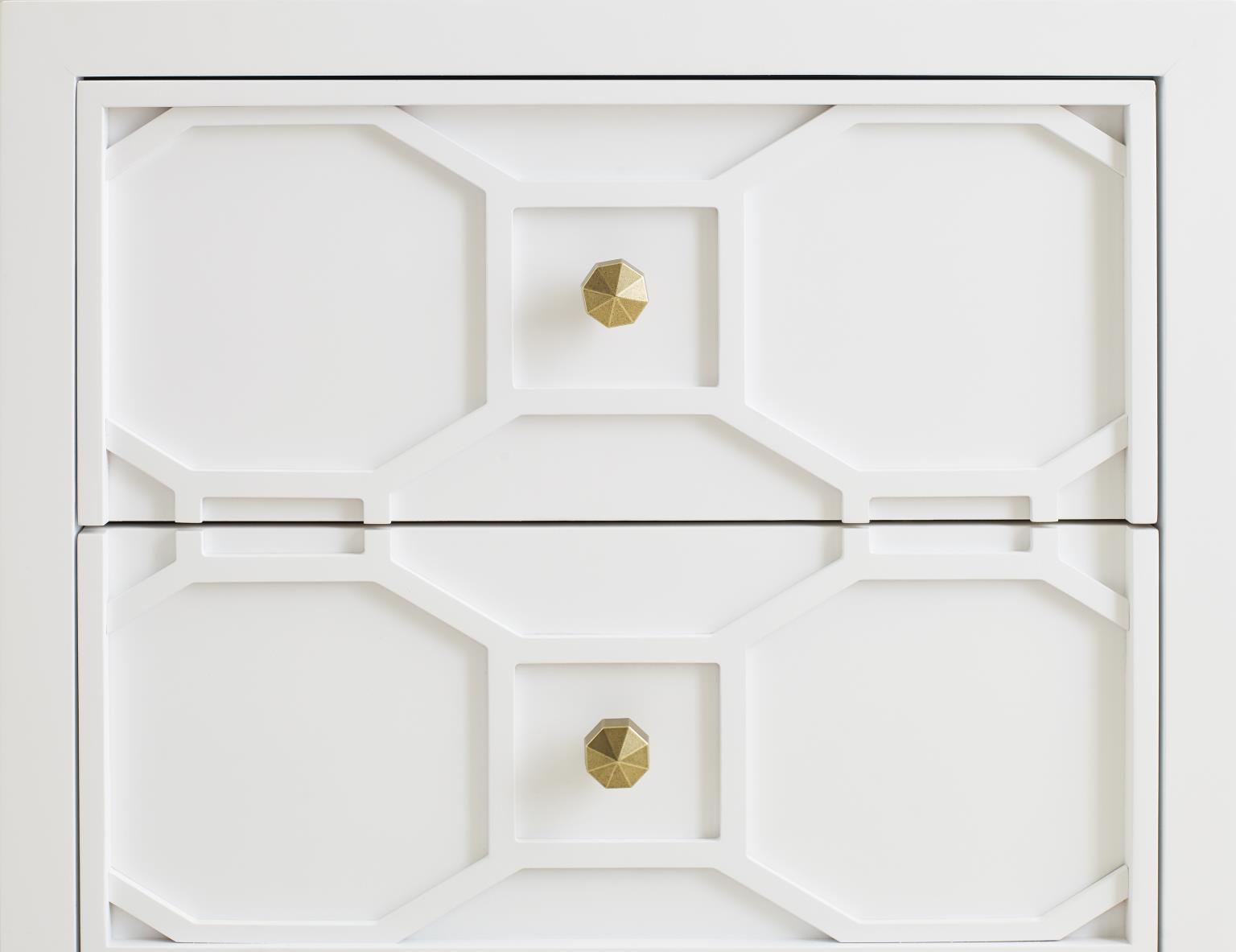 Rachael's Chelsea youth collection is a glamorous, sophisticated grouping that brings her fashion-forward taste to any age. From storage to sleep to study, these modern, intriguing pieces will be loved from a young age to a college dorm room. The clean, transitional lines of the white finish are offset with gold accents and Soft Gold Finish Knob hardware, making each piece as warm and inviting, as it is stylish.