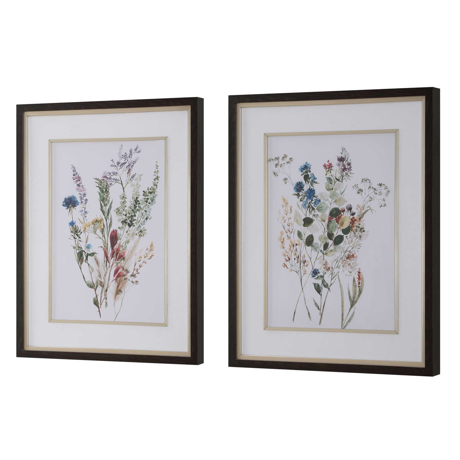 Inspired By Pressed Flowers, These Watercolor Style Prints Display A Warm, Traditional Take On A Spectrum Color Palette. Each Print Is Accented By A White Linen Mat Under Protective Glass With A Dark Walnut Finished Frame And Finished With A Matching Champagne Rabbet And Fillet. Artwork By Aisa Jenson.