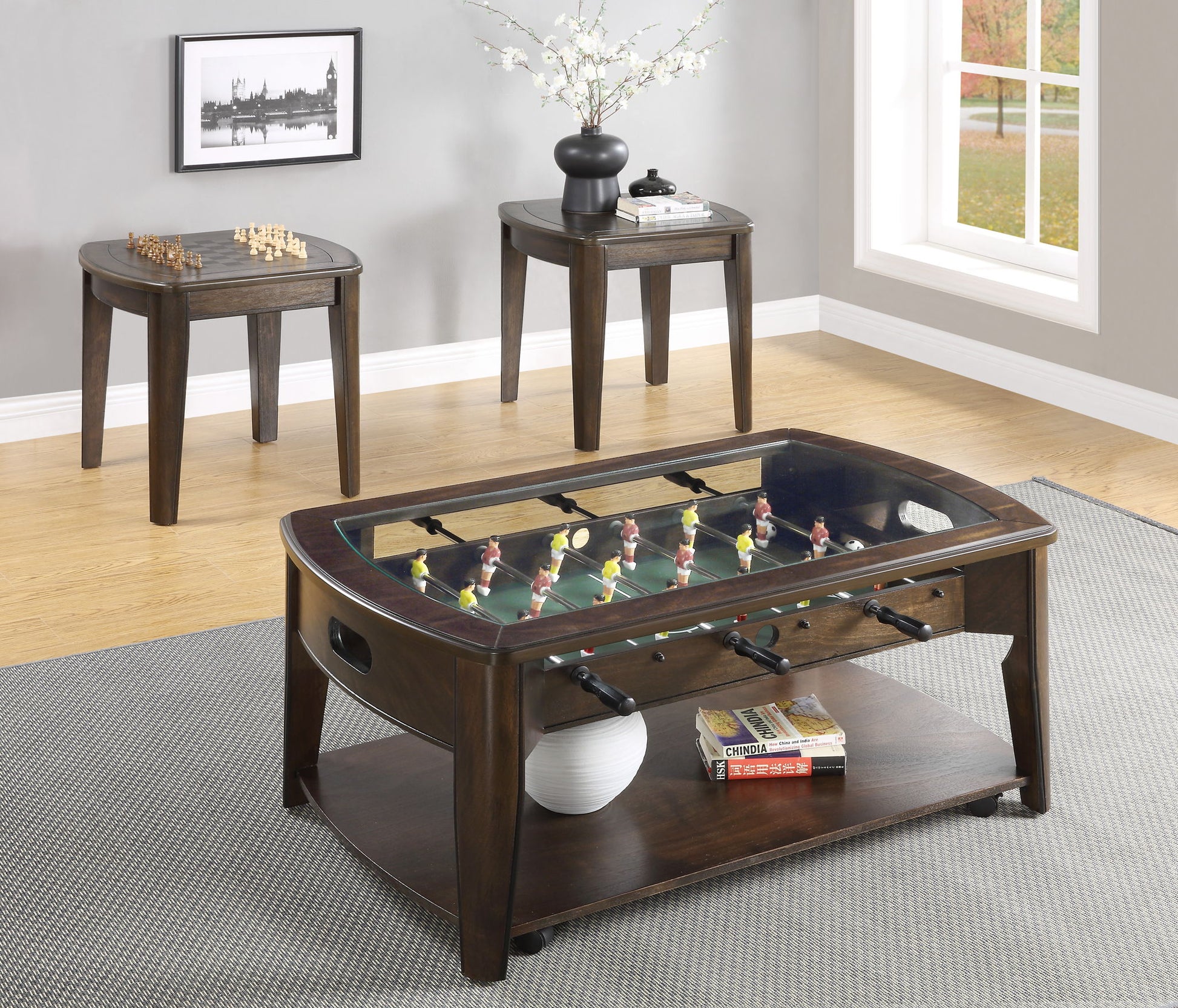 - The Game End Table features a reversible top with one side a traditional top and the other a beautiful inlaid Chessboard. A chess piece compartment is hidden behind the table apron below the top.