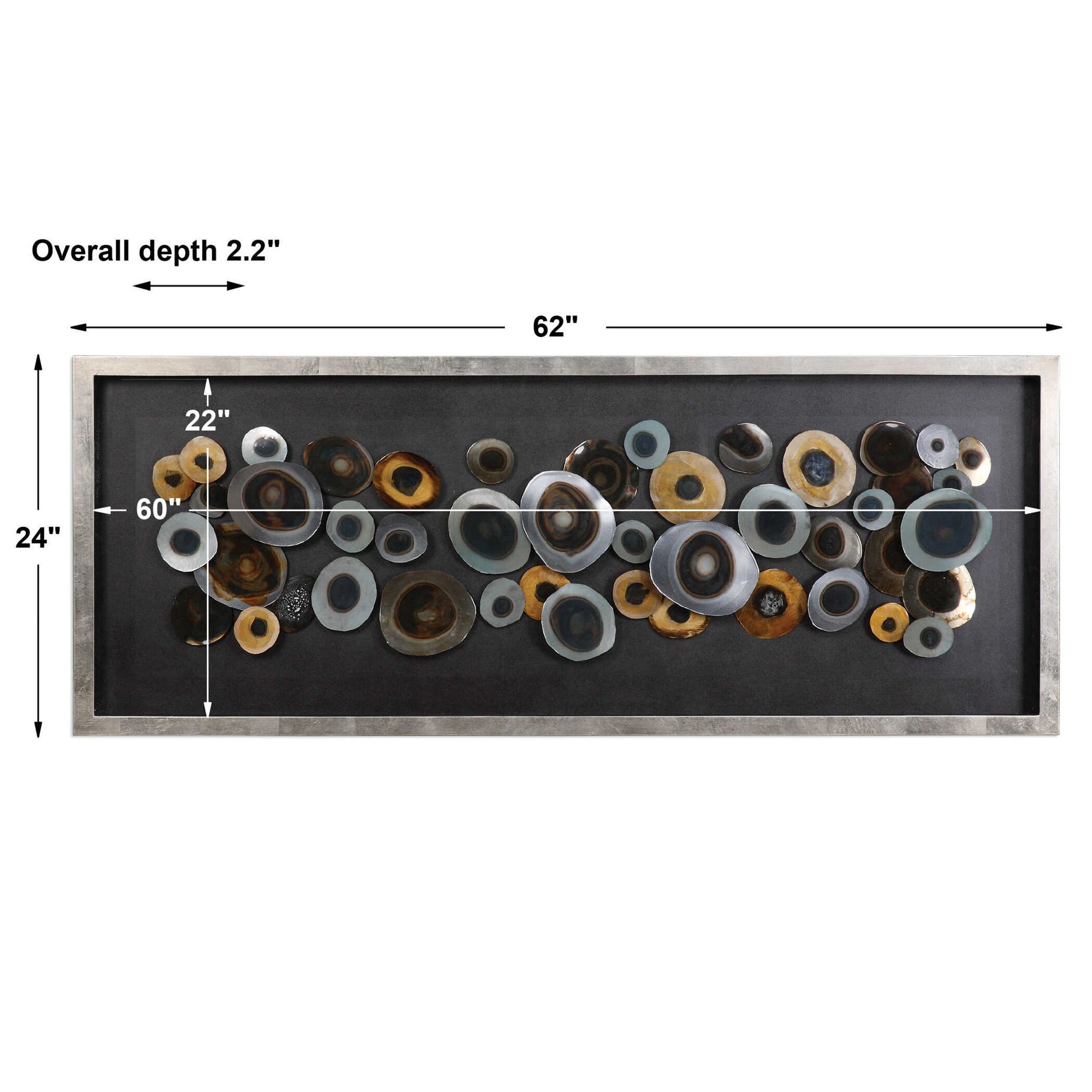 Abstract In Design, This Art Features Overlapping, Blow Torched Iron Discs With Hand Painted Acrylic Accents In Tones Of Silver, Brown And Antique Gold. The Art Is Under Glass And Is Encased By A Lightly Antiqued Silver Leaf Frame. May Be Hung Horizontal Or Vertical.