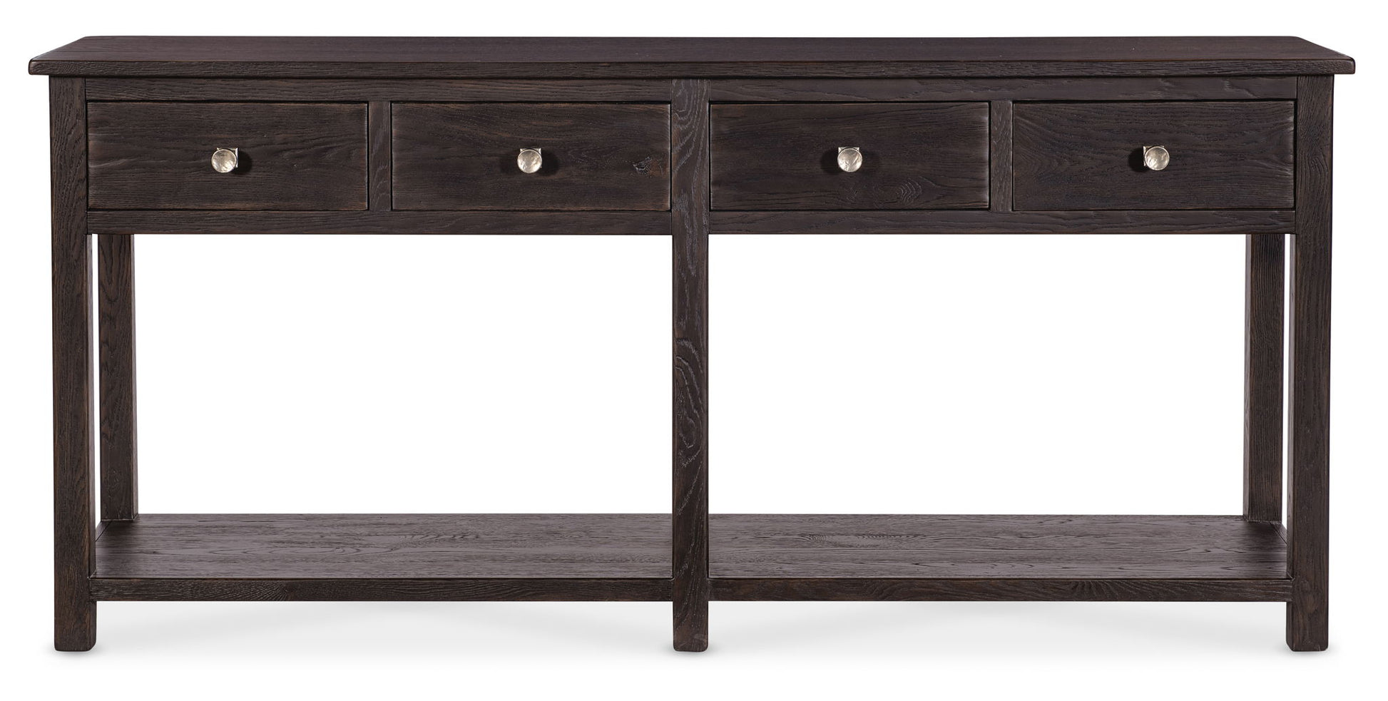 The Driftwood Sideboard Base in warm tones is designed to function as a standalone piece or to pair with the 6820-75900T-80 Display Hutch for a complete display unit. Featuring four self-closing drawers, a removable silverware tray, and a fixed bottom shelf, this base balances utility and rustic design. Its handcrafted finish and oak veneer details offer a textured, naturally aged aesthetic.