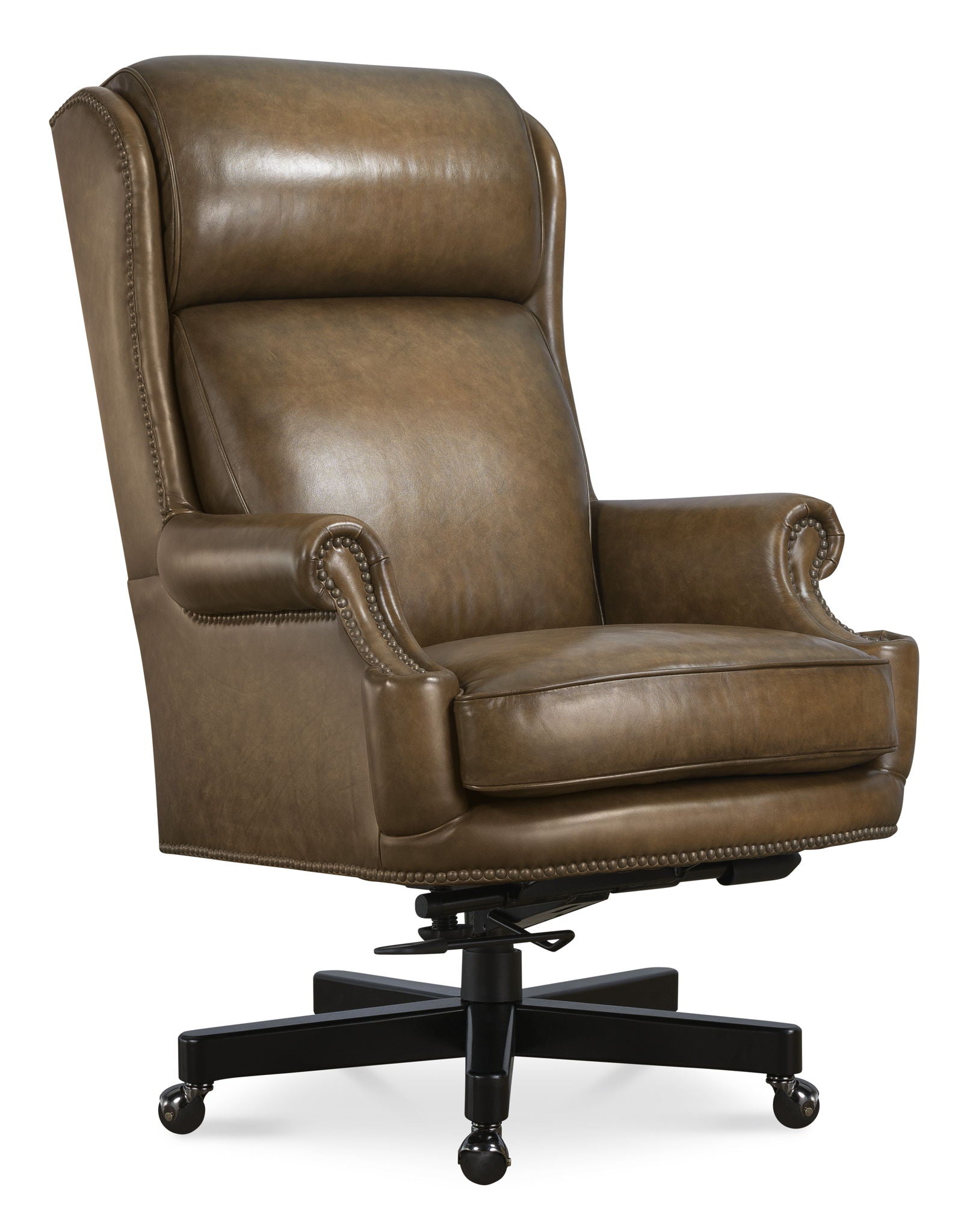 Bring a traditional touch to your workspace with the Tucker Executive Swivel Tilt Chair. This chair, finished in espresso brown with black nickel casters, is upholstered in semi-aniline top grain leather, offering both durability and comfort. Its winged bustle-style headrest and cut-back roll arms enhance its classic look, while the high-density foam provides lasting comfort for any home office.