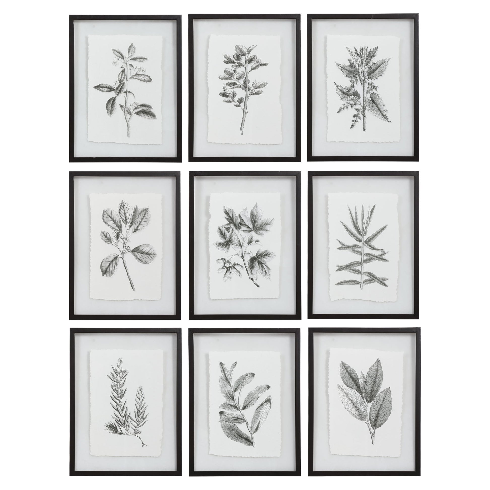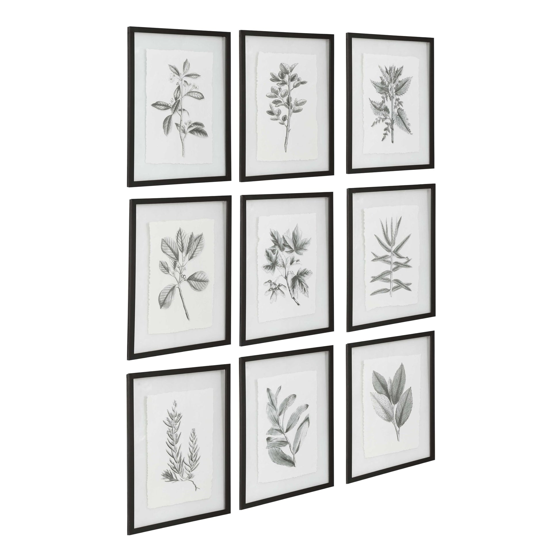 A More Modern Take On Classic Botanical Prints, This Set Of Artwork Showcases A Classic Black And White Theme With Deckled Edges. Each Print Is Placed Under Glass And Accented By A Petite Distressed Matte Black Finished Frame.