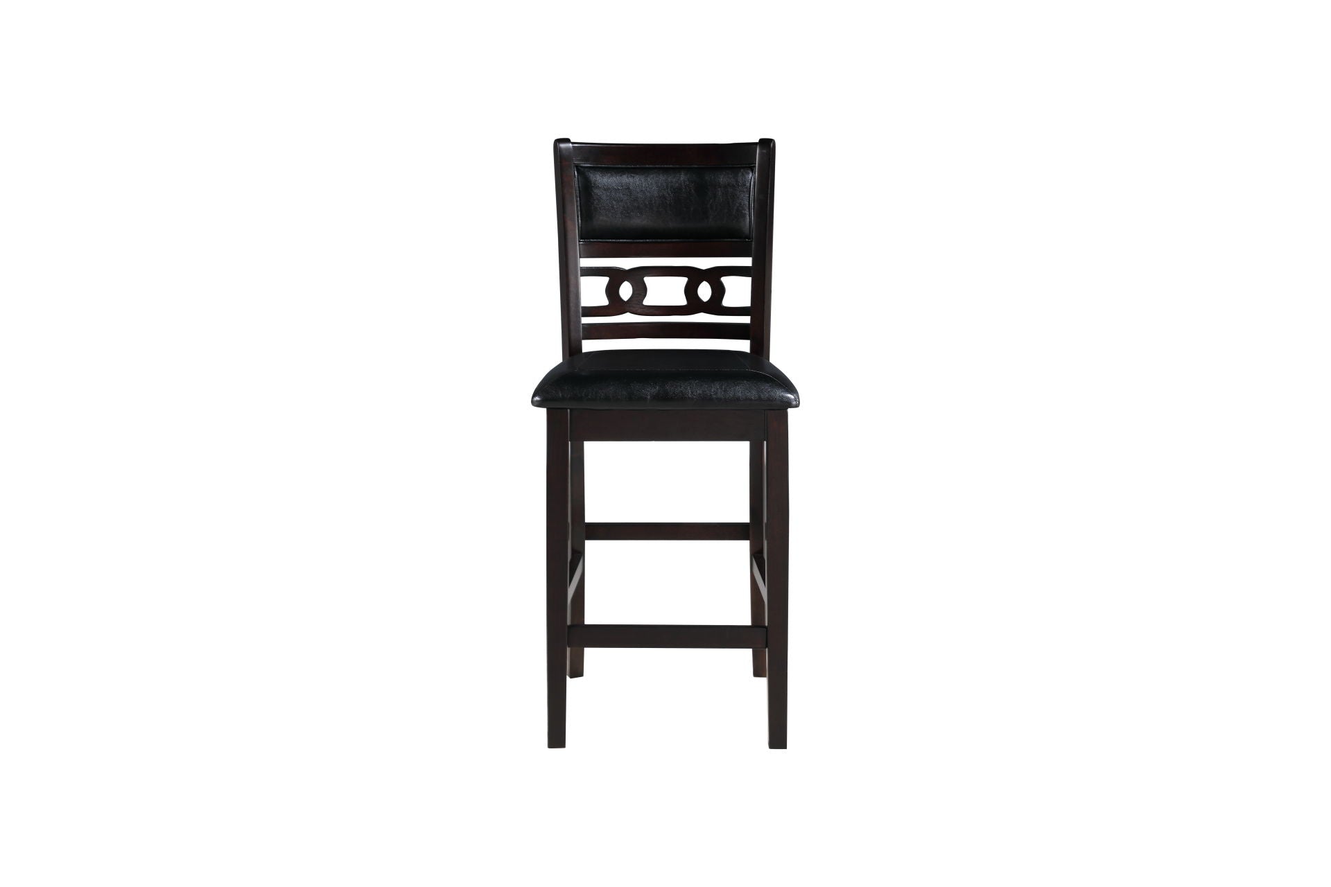 Enhance your dining room with this set of 2 New Classic Gia Counter Chairs in a warm finish. Crafted from solid Rubberwood and Mindi veneers, these chairs combine durability with timeless beauty. The versatile finish accentuates the natural wood grain. Designed for comfort and longevity, the chairs feature black PU upholstered cushions and backs. Solid wood legs, reinforced with four base stretchers doubling as footrests, ensure stability. The distinctive transitional style, highlighted by interlocking chain chair back detail, tapered legs, and clean lines, seamlessly integrates into any setting. Assembly is hassle-free with all necessary hardware and clear instructions included. Backed by a one-year warranty, these Gia Counter Chairs offer a practical and stylish seating solution for your space. Invest in quality and design with this contemporary dining chair set.