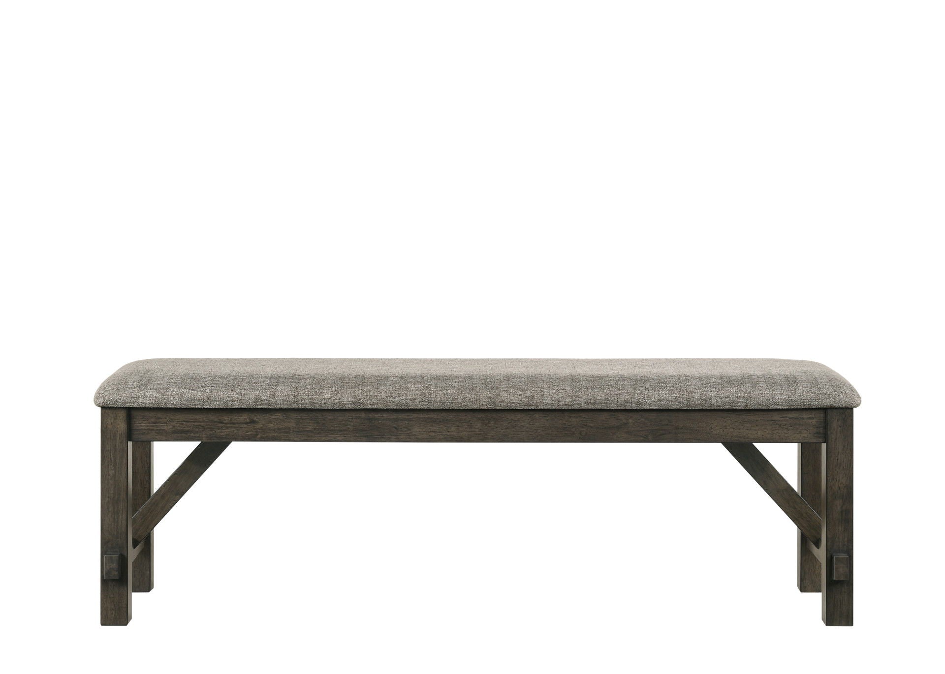 The Gulliver Upholstered Dining Bench in rustic brown offers a combination of quality construction and timeless design, making it a versatile addition to your home. This bench is crafted from durable solid rubberwood and acacia wood veneers, ensuring long-lasting stability. The multi-step rustic brown finish enhances the intricate patterns of the natural wood grains, with subtle notes of gray and charcoal brown adding a touch of elegance. The design merges clean lines with the warmth of distressed wood, featuring robust legs and sturdy base supports that embody modern farmhouse charm. The easy-care polyester and cotton blend gray fabric wraps the resilient foam seat cushion, providing a cozy seating experience. Ideal for extra dining room seating or as a stylish entryway bench, the Gulliver Upholstered Dining Bench seamlessly blends contemporary sophistication with traditional rustic elements.