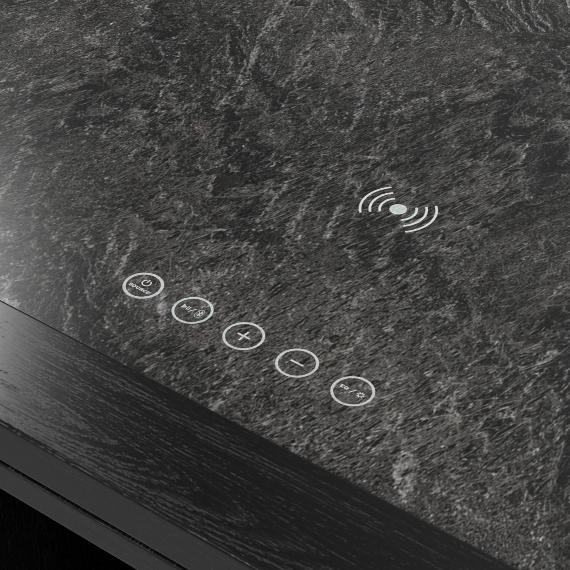 Accent your home’s décor with the modern design of the Halo Smart Coffee Table with Cooler. The touchscreen interface and wireless charging functionality on the elegant sintered stone tabletop add practical convenience without sacrificing aesthetics, while the Bluetooth speaker allows for effortless device pairing. The cooler drawers keep snacks and drinks comfortably cool and feature aesthetic polychromatic LED lighting. Enhancing its versatility, the streamlined black finish makes this piece easy to pair with various color palettes and existing décor. The Halo Smart Coffee Table with Cooler is a perfectly modern blend of both style and convenience.