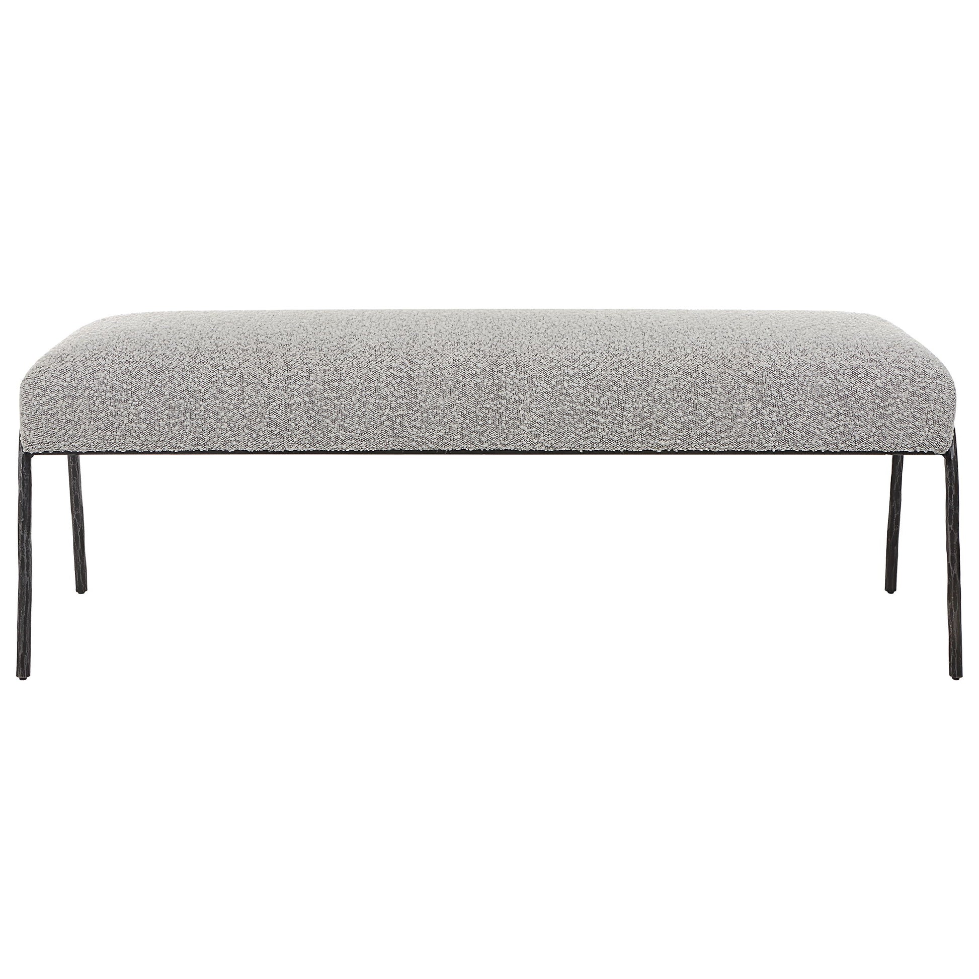 Inspired By Scandinavian Designs, This Bench Showcases Elegant Curved Lines With A Chiseled Iron Frame In A Natural Aged Black Iron Finish. A Casual Ivory And Warm Gray Textured Boucle Fabric Accents This Modern Look.