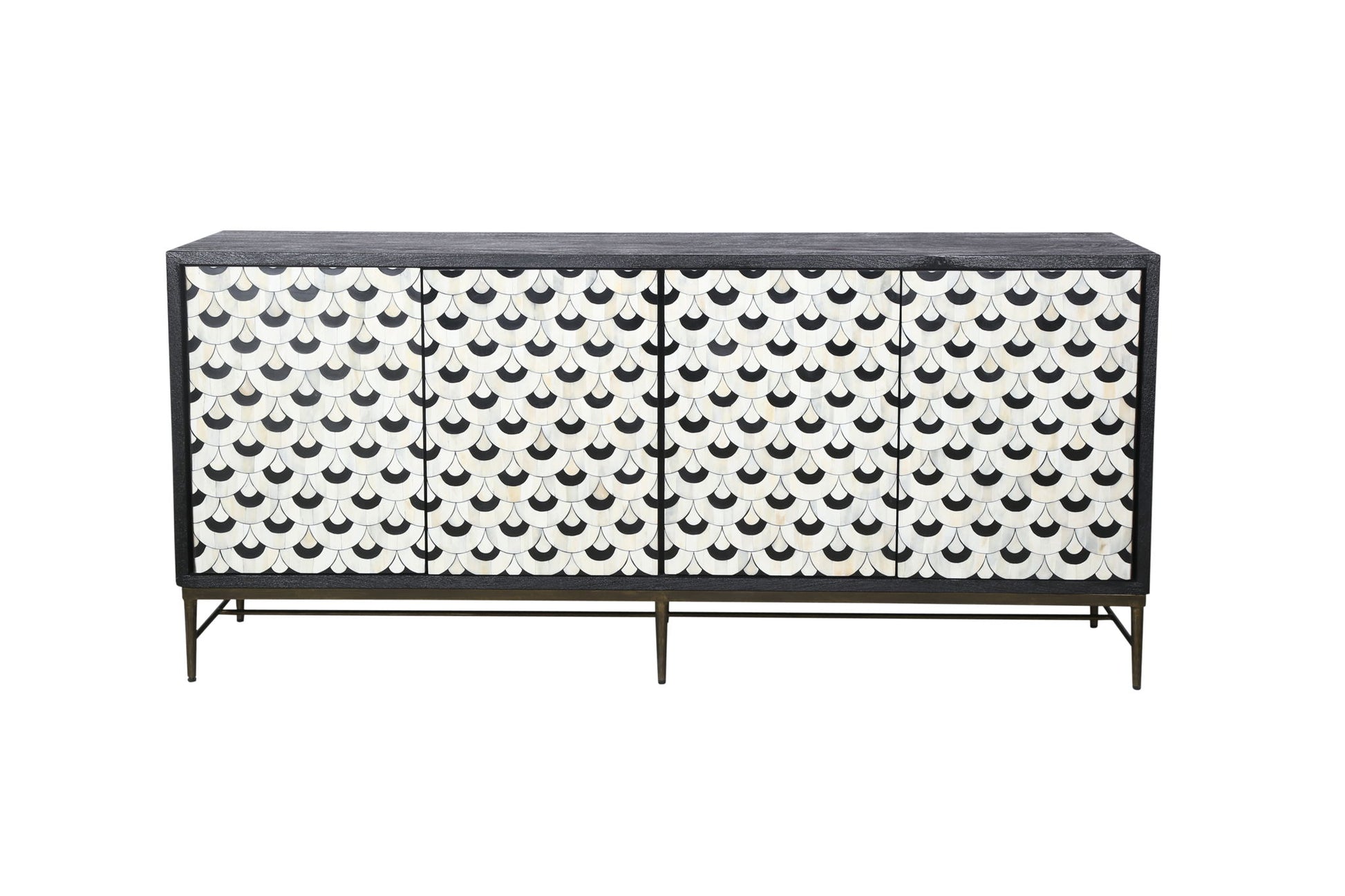 - The scalloped pattern on the doors features a striking contrast of ivory and black bone and resin