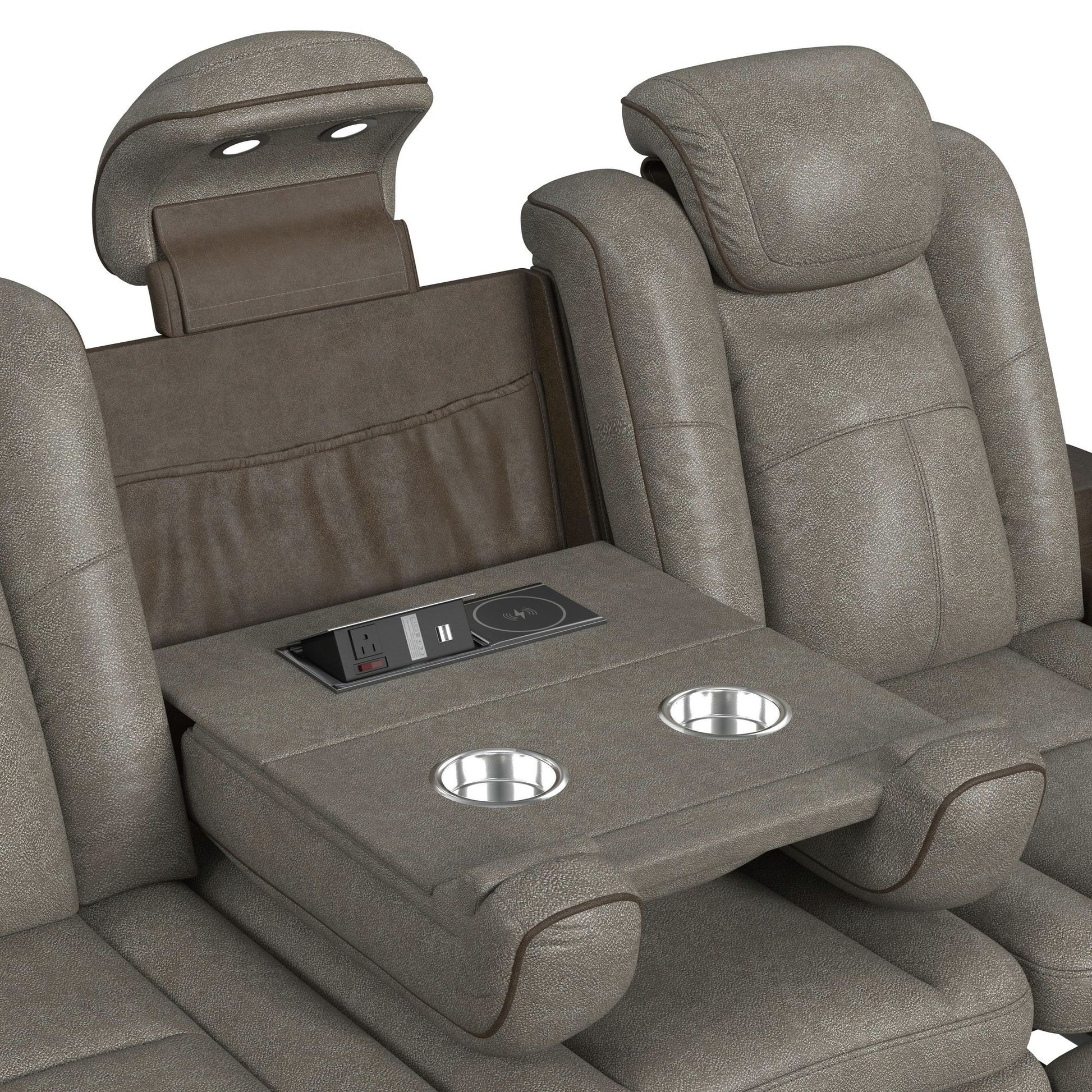 Unwind in luxurious comfort with the Lantana Living Room set, a perfect blend of modern functionality and timeless style. Featuring power motion reclining with adjustable power headrests, this set ensures optimal relaxation. The dual-tone and faux leather upholstery adds a stylish touch, while the sofas drop-down table with built-in cup holders keeps your essentials close at hand. Enjoy added convenience with the sofas reading light, power strip, and LED light, while the loveseat offers a console with wireless charging and LED light. Complete with hidden storage in the arms and USB ports, the Lantana is designed for effortless living.