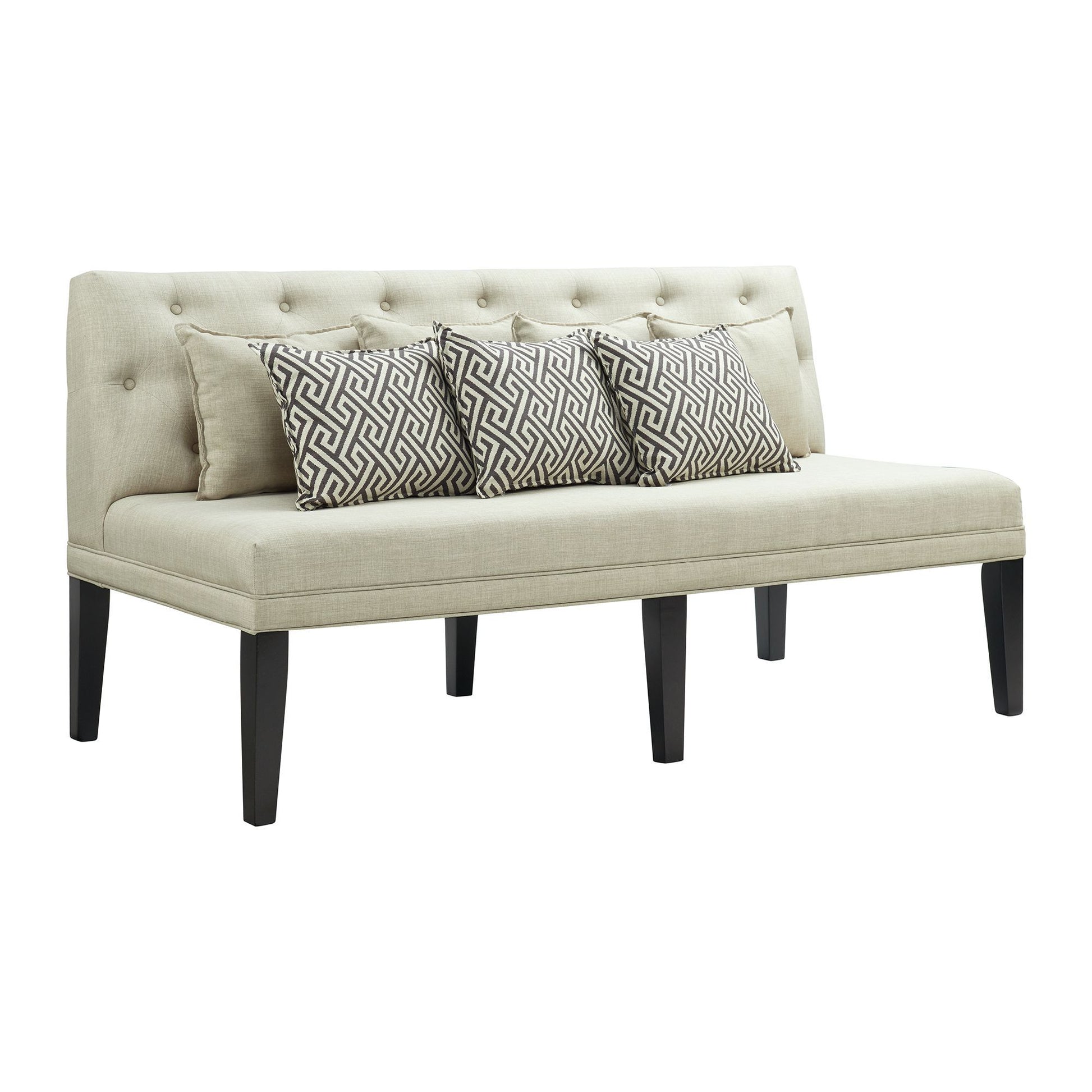 The Maddox Dining Sofa with Seven Pillows takes dining seating to the next level. This piece is fully upholstered in taupe fabric. Four taupe pillows and three grey decorative pillows with geometric designs accent this piece. Button tufting along the back adds extra flair to this already stunning piece. No need to worry about comfortability, as this sofa has foam cushion for the back and seat. Not to mention, the dark wire brush finish of the legs gives great contrast with the taupe fabric. This sofa seats three comfortably. Add this sofa to the dining table in this collection for a perfect pairing.