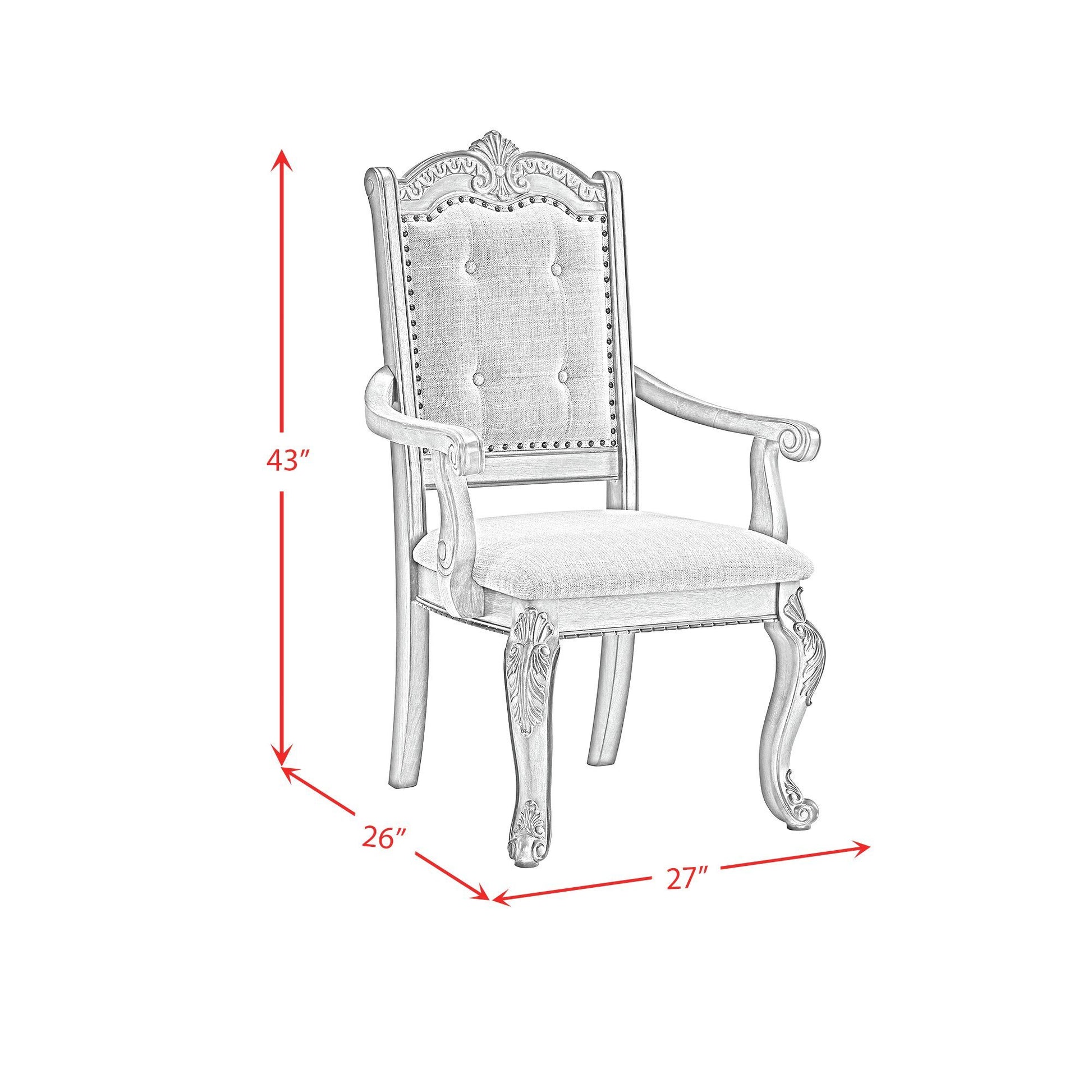 The Madison Park Arm Chair epitomizes elegance with its rich walnut finish, infusing warmth and sophistication into any dining space. Ornate carvings throughout the chair exude timeless charm, while silver nailhead trim on the chair back adds refined elegance and a touch of luxury. Carved arms and legs showcase intricate beauty, enhancing its classic appeal. Upholstered in tufted beige fabric, the chair offers a plush and inviting feel, ensuring comfort during meals and gatherings. With its traditional design that never goes out of style, the Madison Park Side Chair is a perfect blend of timeless beauty and functional comfort for your dining room.