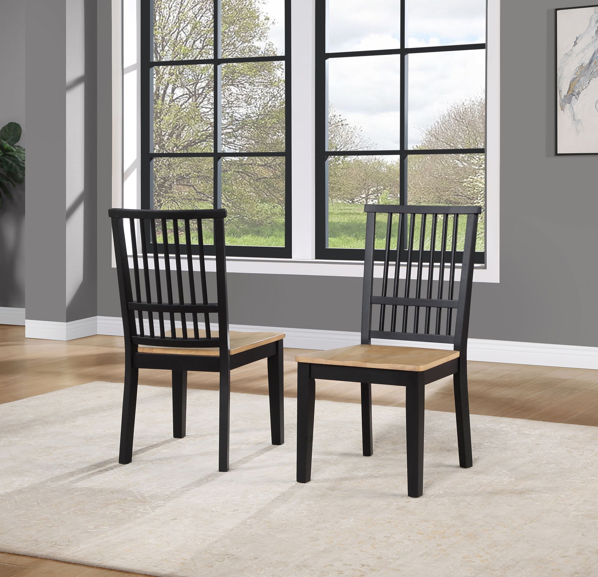 Clean lines and a lustrous two-tone finish make this solid wood chair and instant classic. An ebony finished spindle back marries beautifully with a natural finished solid wood seat in a modern farmhouse symphony of style. Durability features like blocked and screwed corners ensure strength and durability of a chair for a dining, living room or office.