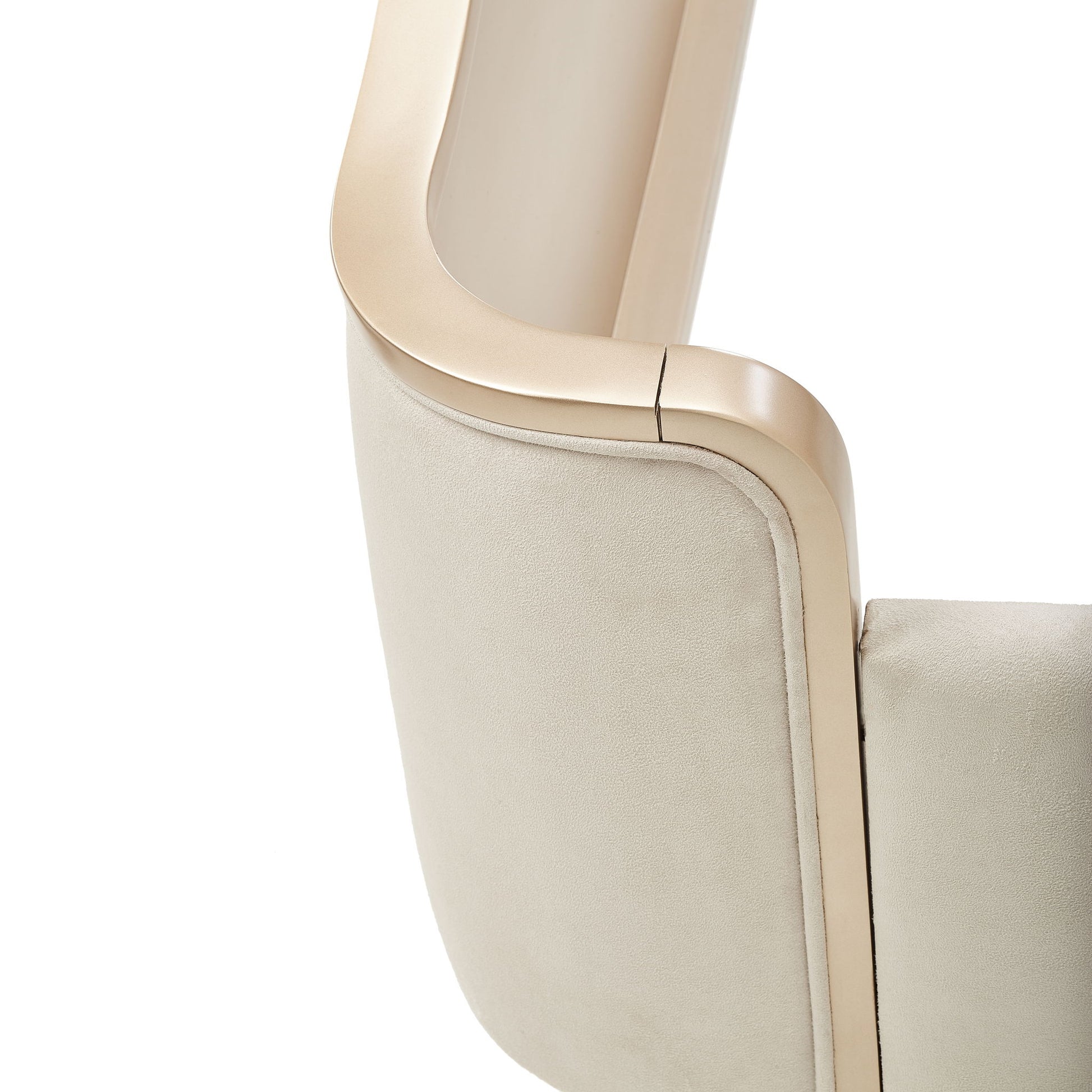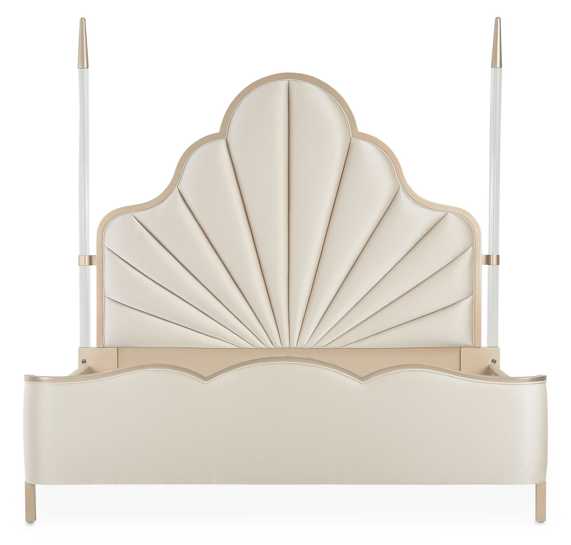 Make a stunning and dramatic home statement with the Malibu Crest Scalloped Panel Poster Bed! Notice the subtle shine on the faux silk fabric and how the light illuminates the Chardonnay finished trims. These details, paired with the glamorous acrylic posts, create a rich design made to complement your sophisticated style.