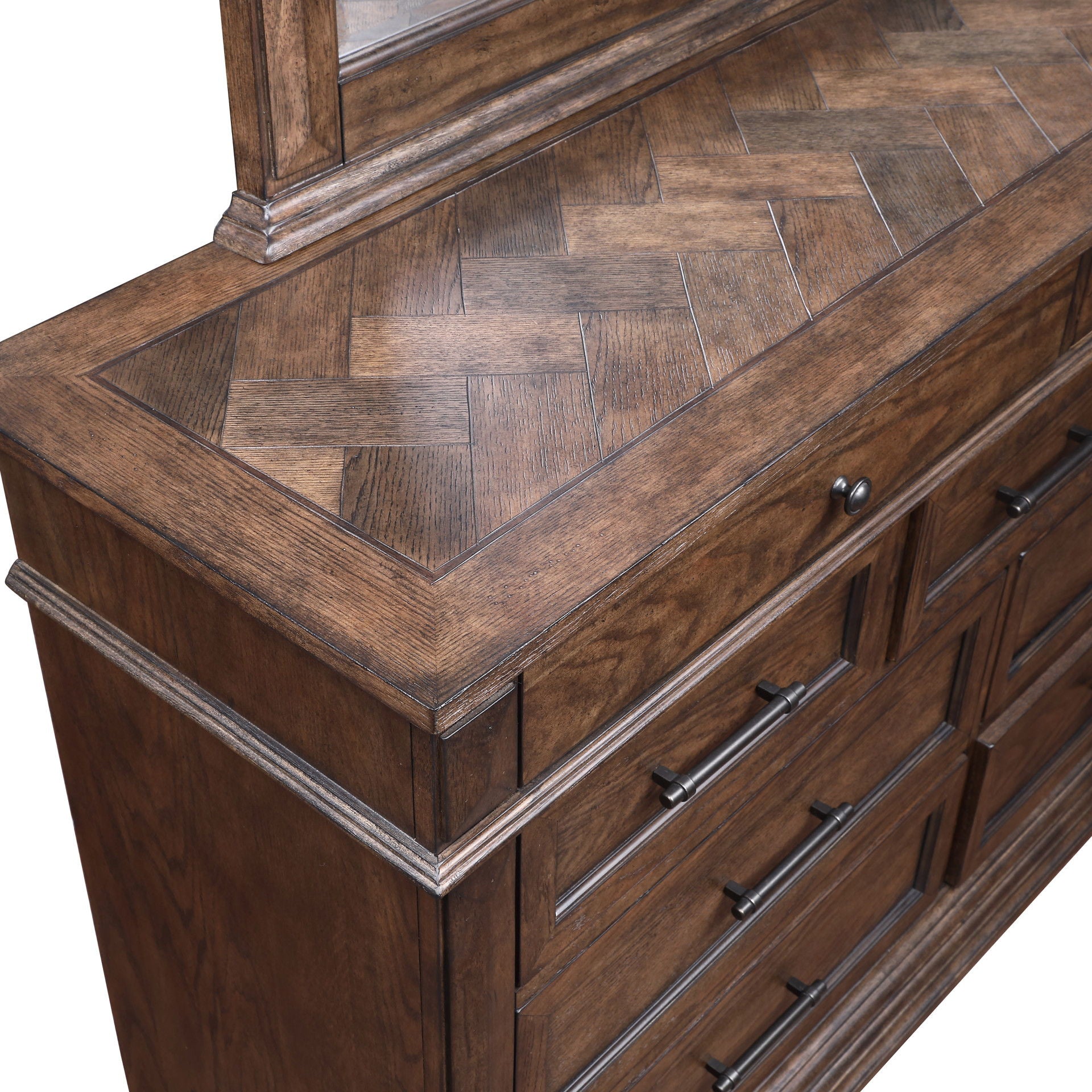 - Rich Walnut Finish: The heirloom finish is achieved through a multi-step process that includes mild distressing, wire brushing, and charcoal glazing that enhances the natural beauty of the wood.