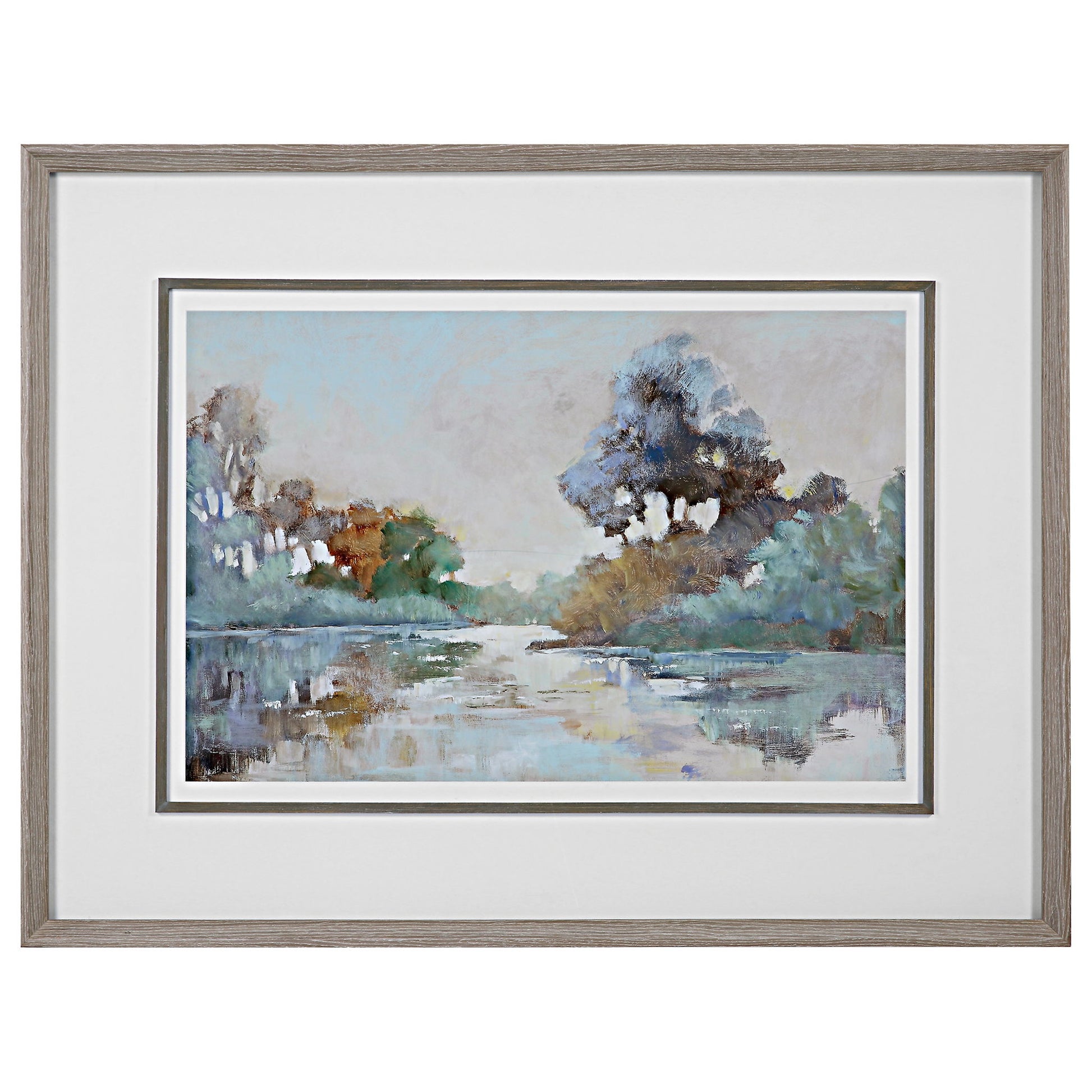 Inspired By Traditional Landscapes, This Artwork Expresses An Updated Look With Soft Blush, Blue, Green, And Amber Tones In A Watercolor Style. The Print Is Underscored By Clean White Matting With A Frame And Fillet Finished In A Brushed White Oak Finish. Artwork By Mary P. Buckley.