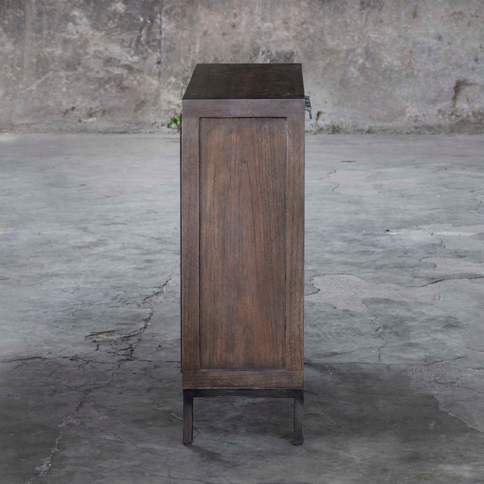 Soft Contemporary Styling, Featuring A Paris Silver Finish, A Subtle Metallic Silver Over A Light Walnut Stain, Set Atop A Simplistic Iron Base Finished In Aged Steel With Coordinating Door Pulls. Has Two Adjustable Shelves.
