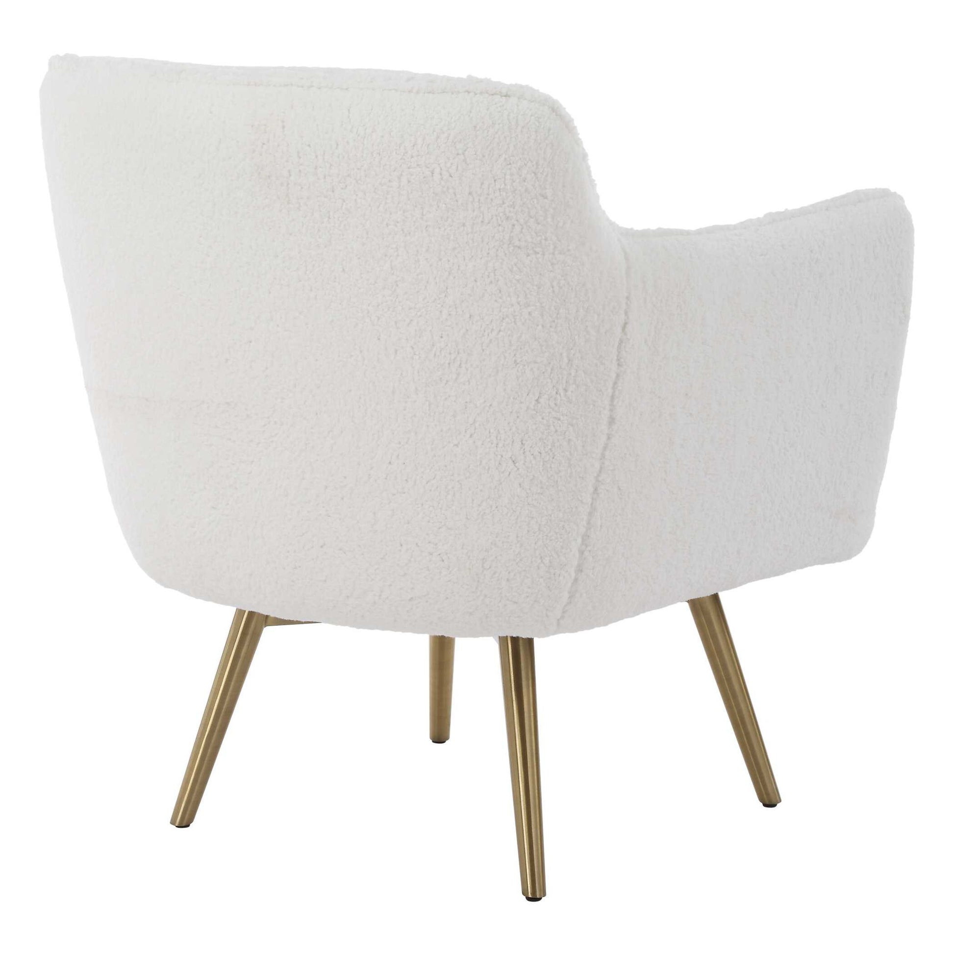 Nestle Into The Surrounding Comfort Of The Oasis Swivel Chair. Gently Sloped Curves Are Accentuated With A Welt Trim Of An Ultra Plush White Faux Sheepskin Fabric. Complete With A Swivel Return Atop Tapered Stainless Steel Legs Plated In Brushed Brass.