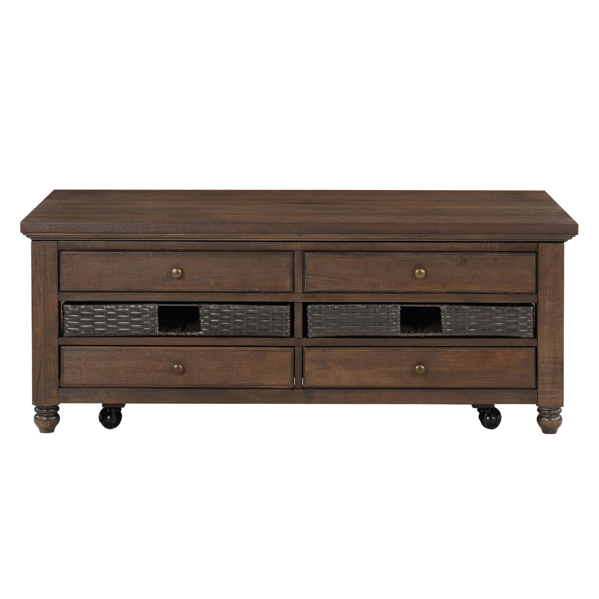 A collection of tables offering bountiful storage in a beautiful design. With classic styling and removable baskets, Oliver exudes farmhouse charm while remaining practical. A lift-top Cocktail Table with casters centers the group with the ultimate in functional design. A burnished chestnut finish adds warmth, while details like the turned bun foot, plank top, and beveled drawer front enhance its appeal..