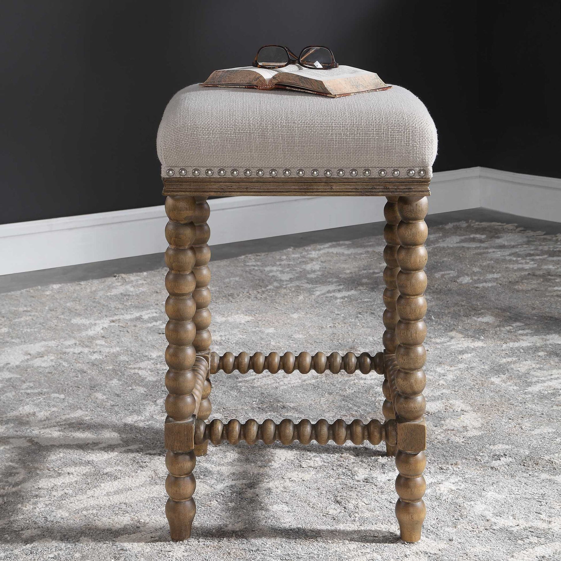 A Casual Statement Counter Stool Featuring Spindle Turned Legs And Carved Trim Finished In A Light Walnut Stain. Plush Seat Is Tailored In A Beige Linen Blend Fabric With Added Performance Treatment To Resist Soiling And Stains, Accented With Brushed Nickel Nail Head Trim.