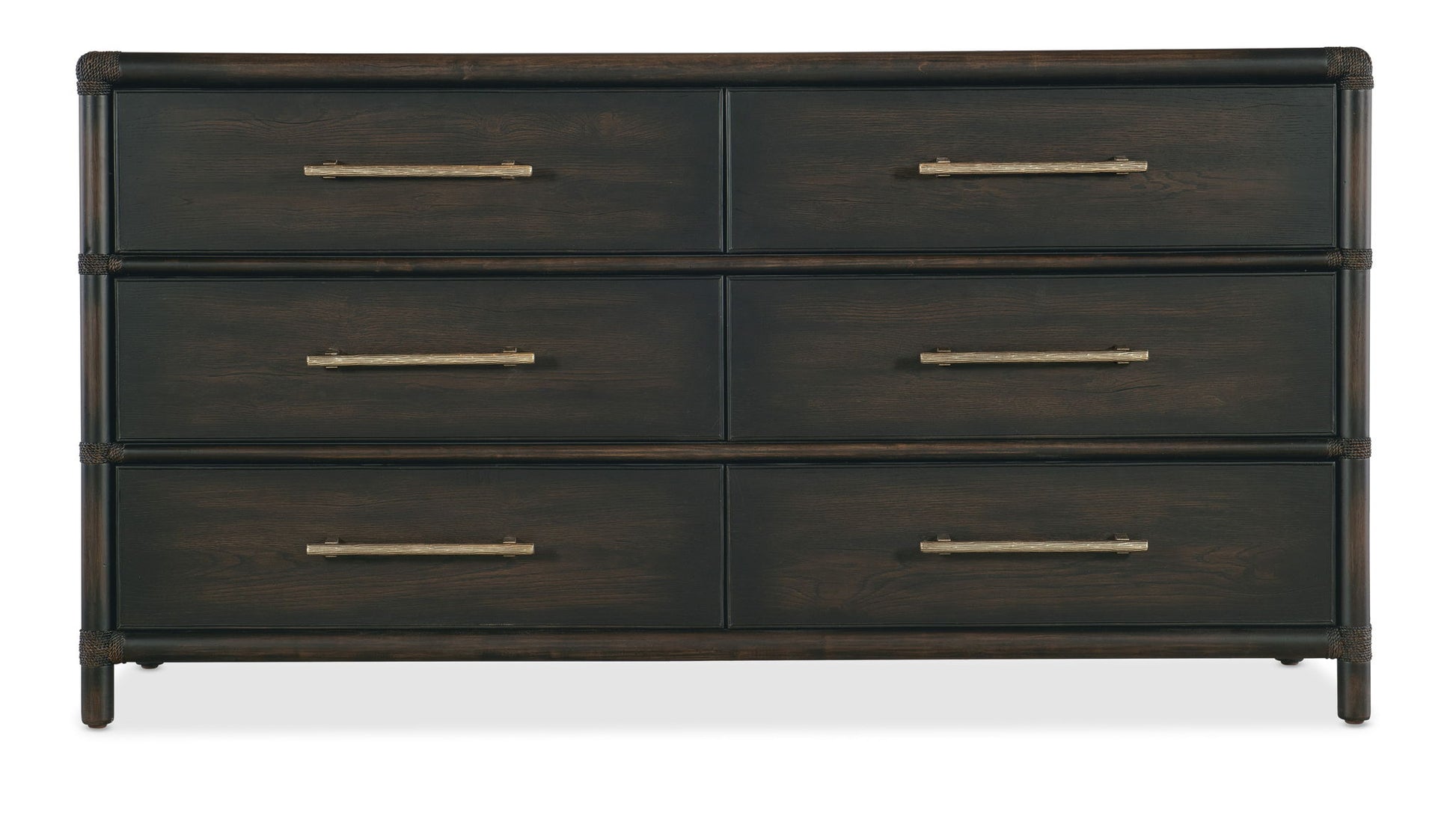 Inspired by tropical getaways, the Retreat Pole Rattan Dresser is a blend of natural materials in a laid-back, versatile design. Crafted of Oak and Maple Veneers with Rope accents, the dresser is finished in Sand, transparent by design to reveal the unique grain patterns in the wood veneer. Offering six self-closing drawers, the top left drawer has a removable felt liner and the top right drawer has a removable felt liner. The bottom two drawers are cedar-lined. The textured, pewter-colored bar pulls add a look of natural elegance.