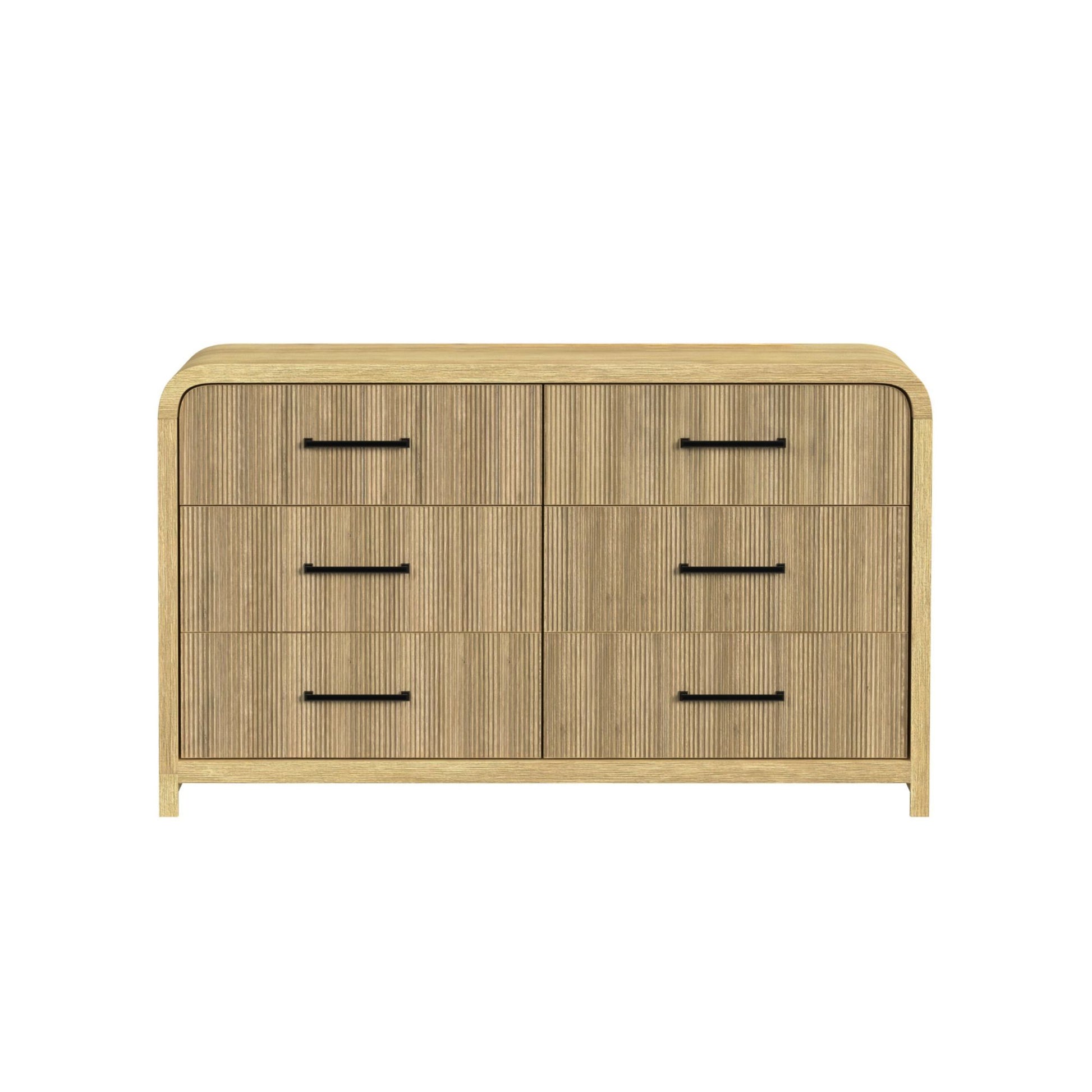 Enhance your bedroom with the stylish Ridgemont Dresser. Finished in a light wood with natural grain detailing, this piece brings warmth and elegance to any space. Sleek, rounded edges and vertical reeding throughout create a modern yet refined aesthetic. The dresser features a black felt-lined top drawer, providing protection and organization for your essentials. Spacious drawers, accented with bold black bar pulls, offer ample storage. With clean, minimalist lines, the Ridgemont Dresser combines function and contemporary design, making it an ideal addition to your bedroom.