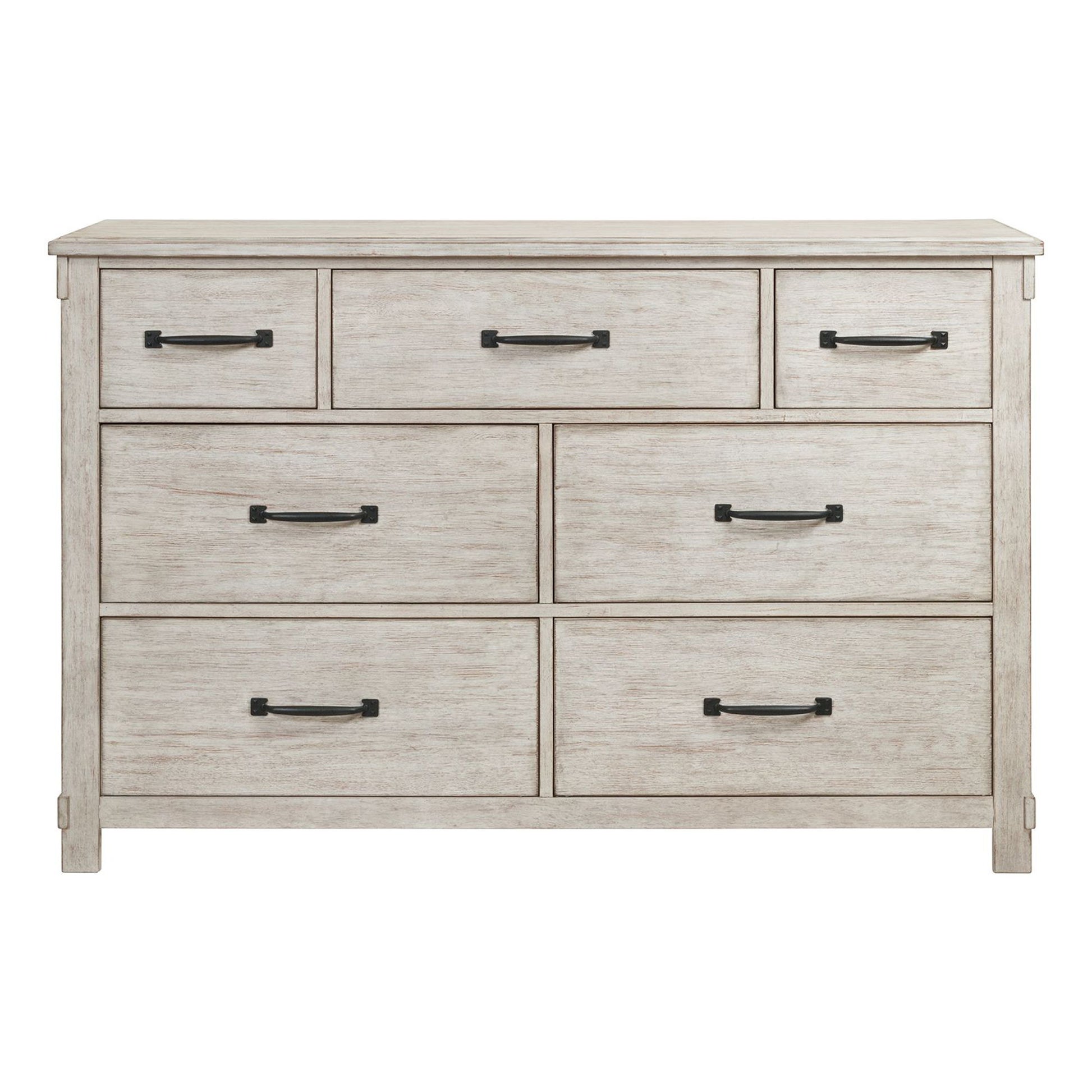 The Scott 7-Drawer Dresser is the perfect addition to your home! This dresser offers plenty of storage space for your clothes. The top drawer has black, felt lining to better protect your more delicate belongings. Dark metal drawer pulls complement the distressed finish beautifully. This dresser will easily match any existing decor you might have. Add this dresser to your home today for a transitional farmhouse look that will last year after year!