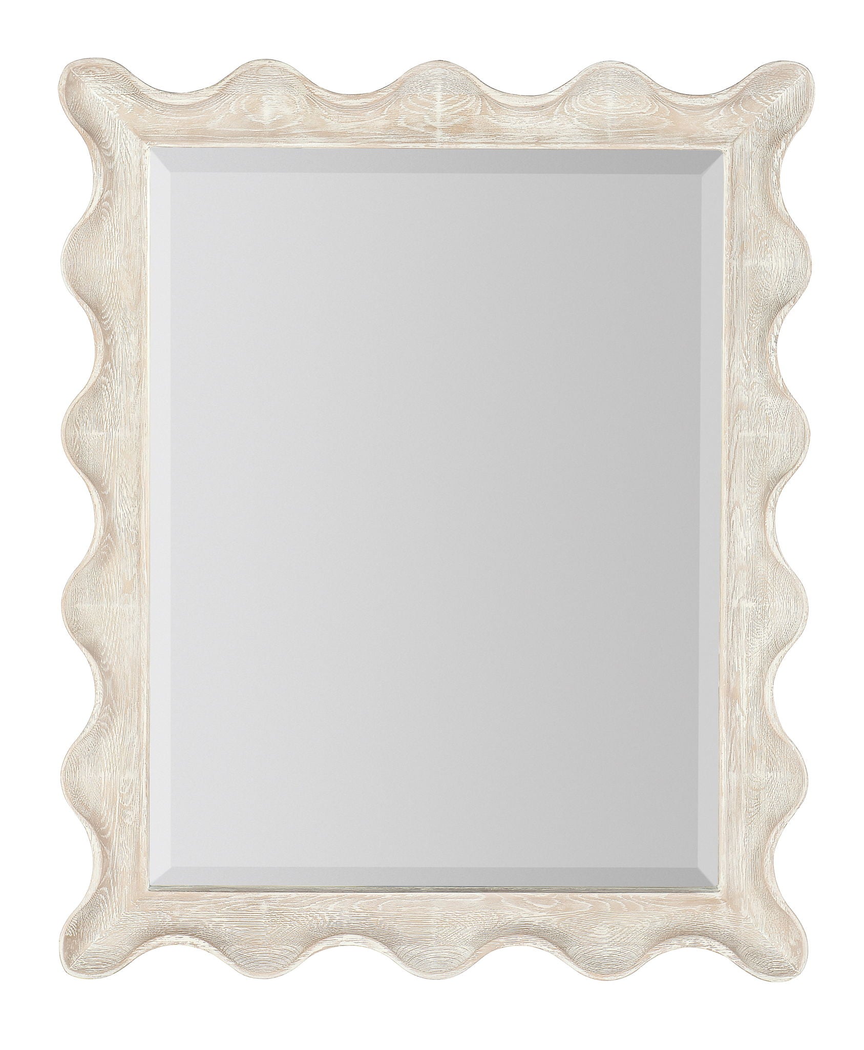 ring the relaxed aura of the outside in with the lovely scalloped-edge Bora Landscape Mirror in the refreshing Surf finish, an airy whitewashed oak with wire-brushing detail.