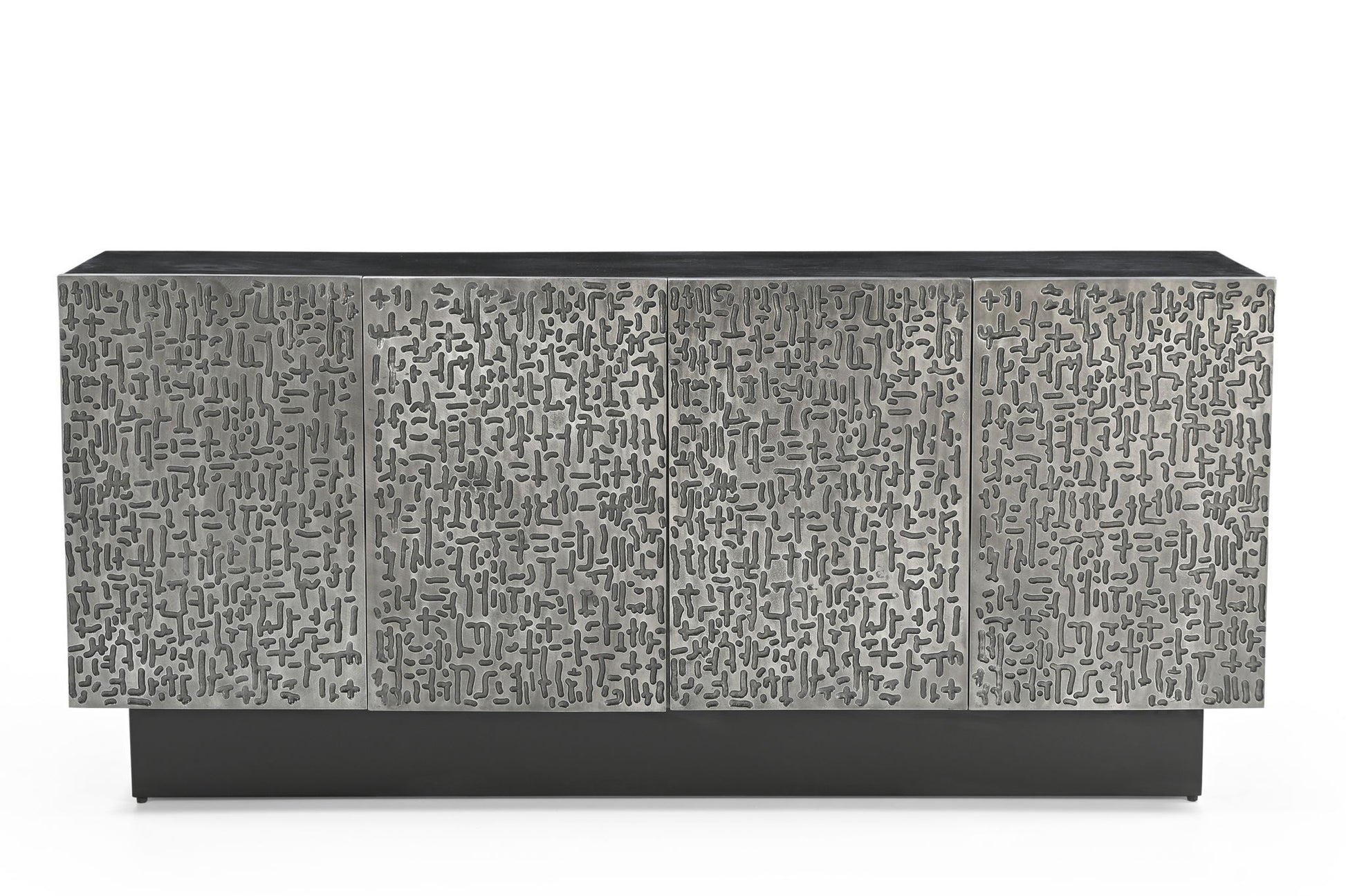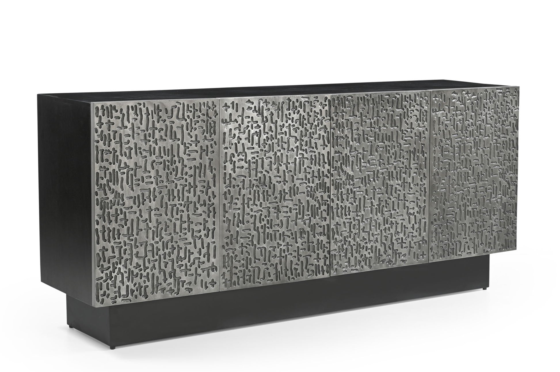 The Sevigny Server is a bold, modern inspired statement piece that commands attention. Crafted from solid mango wood in a sleek matte ebony finish, the case provides a refined and understated backdrop. The doors are the true highlight, made from cast aluminum with a striking contemporary textured design in an antique pewter finish, creating a bold contrast. Behind the four doors, adjustable shelves and media cord management ensure both style and functionality are seamlessly integrated. This server is designed to be the centerpiece of any modern space, combining striking design with practical storage.