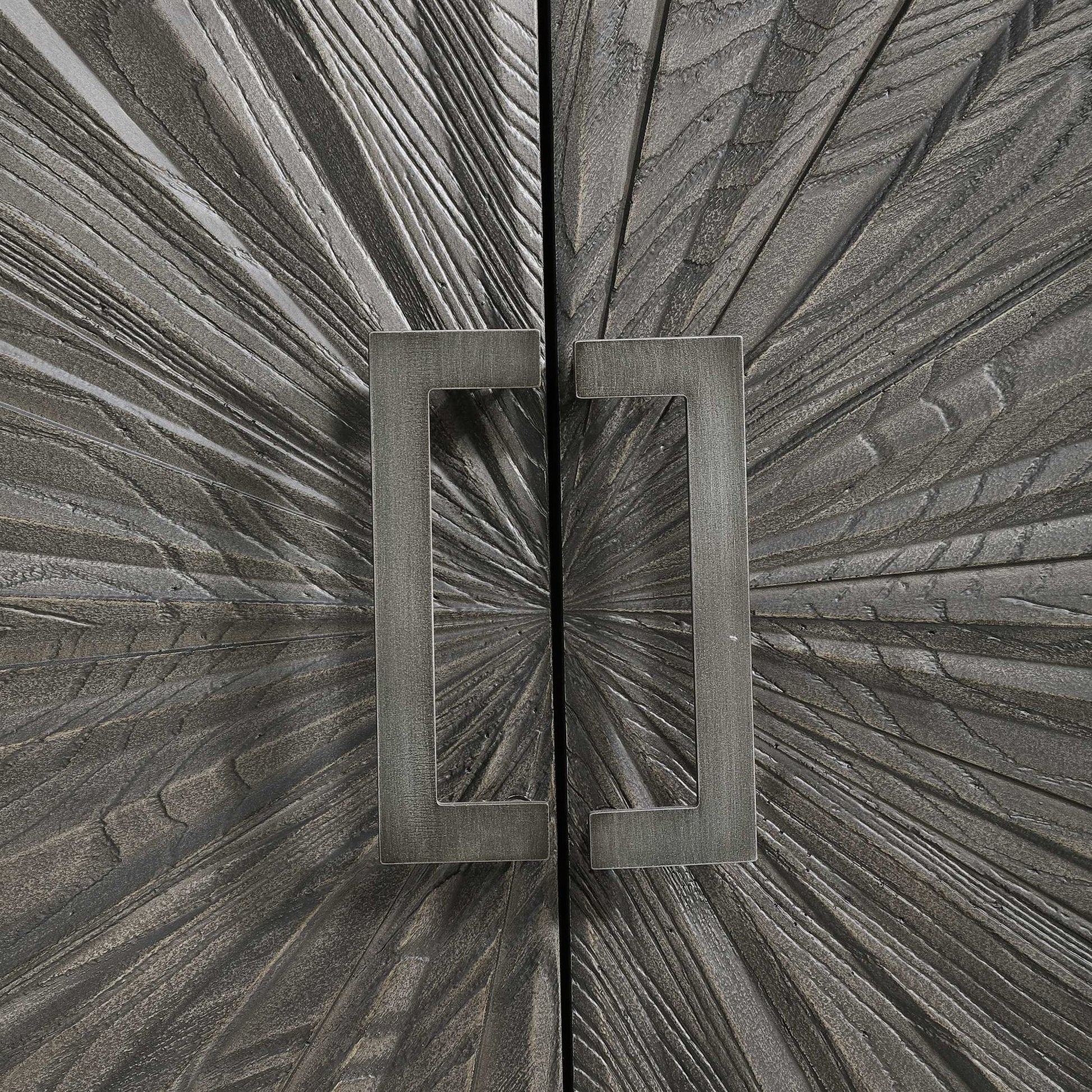Inspired By Global Bohemian Style, This Two Door Cabinet Features A Striking 3-dimensional Starburst Design, Finished In A Dark Ebony Oak Veneer. The Contrasting Solid Wood Case Is Finished In A Gray Oak Stain, Accented By Steel Hardware And Accent Stretcher Finished In Aged Gunmetal. The Pair Of Soft Close Doors Open To Reveal Two Sections Each With Two Adjustable Shelves And Wire Management.