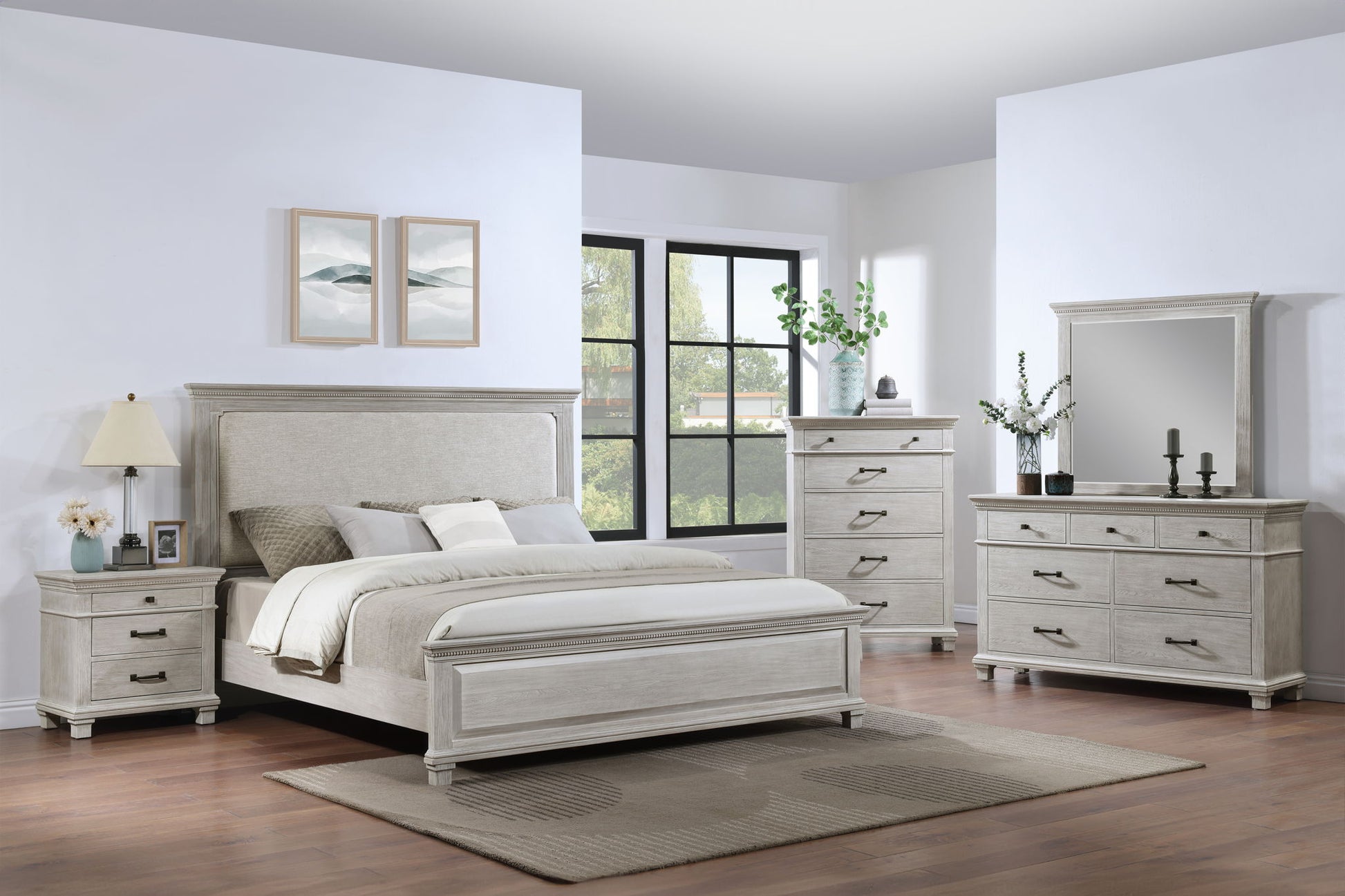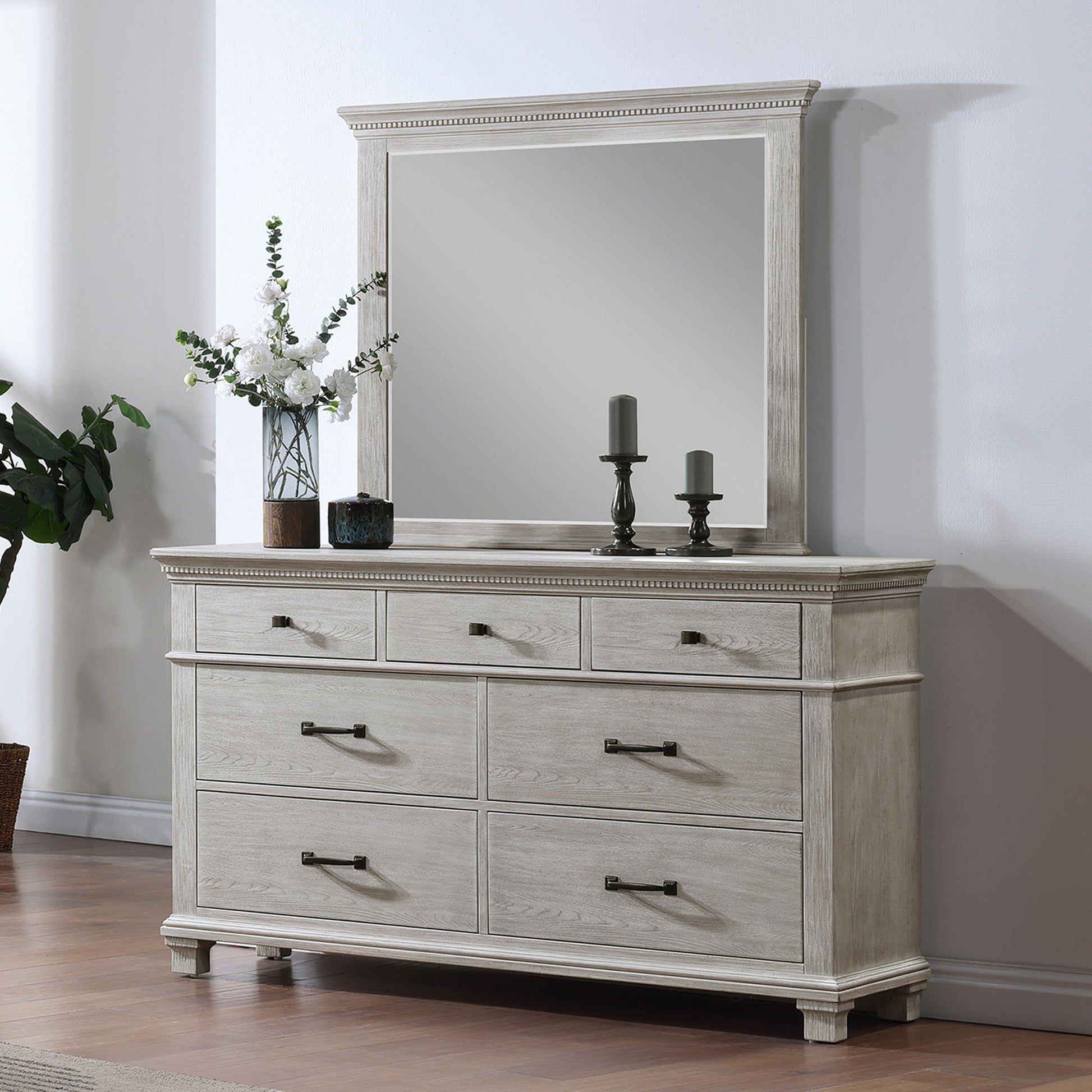 The Silver Sands Dresser combines durability and quality construction, crafted from solid pine, manufactured woods, and oak wood veneers for a strong and stable piece. Its transitional style merges clean, simple lines with a rustic wood finish, creating a calm and inviting atmosphere. The misty finish, achieved through a meticulous multi-step, hand-applied process, offers a light, weathered look that highlights the natural grain and mineral patterns of the wood. Elegant design features, including a raised base, full return and dentil moldings, and contrasting hardware, add a sophisticated touch. Heirloom-quality drawers with dovetail joinery and three-stage steel ball glides ensure smooth, full-extension operation and can support heavy loads. With seven spacious drawers, including velvet-lined top drawers to protect delicates, this dresser provides ample storage for clothing essentials. Combining style, durability, and functionality, this dresser is a practical and elegant addition to any bedroom.