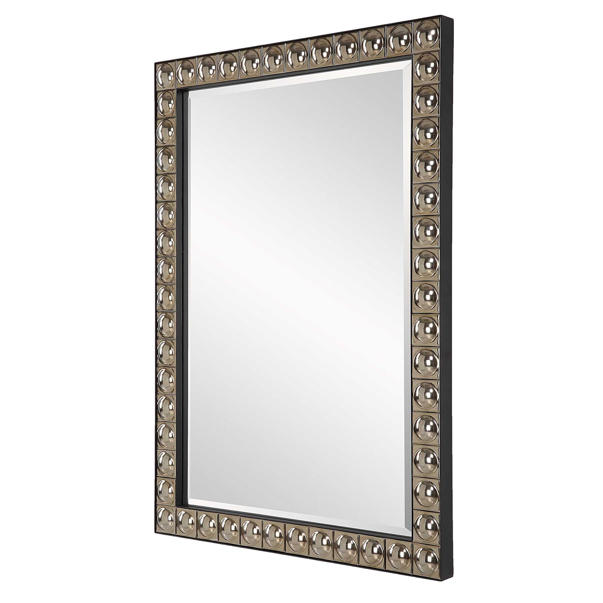 This Unique Vanity Mirror Features Repeated Ceramic Tiles With Convexed Centers Finished In An Antiqued Silver-champagne Plating, Encased In A Black Iron Inner And Outer Frame. Mirror Has A Generous 1 1/4" Bevel.