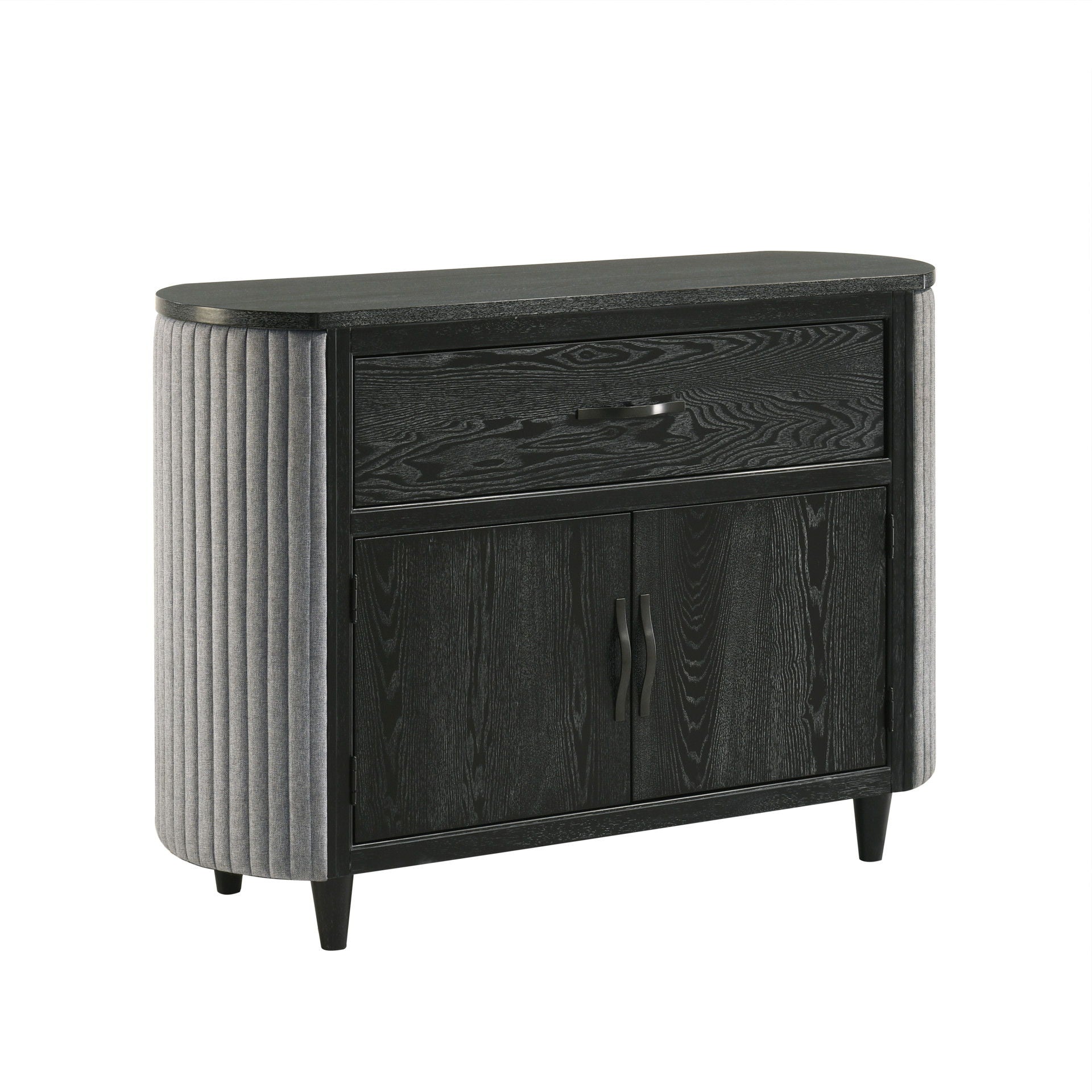 - Mixed Material Mastery: Textured gray ribbed fabric curves around each side of the chest, creating a striking contrast against the dark wood finish, adding visual intrigue while softening the overall look.