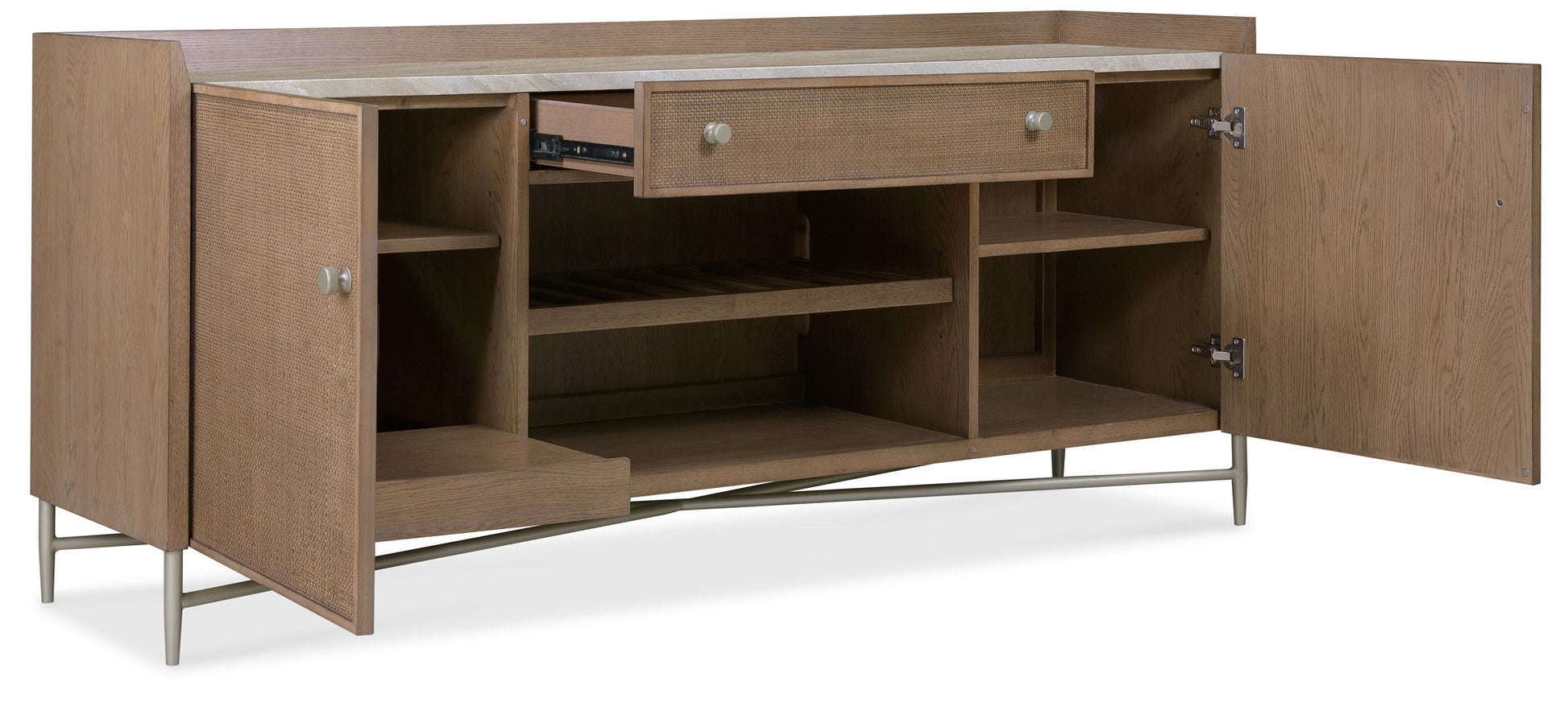 Mixing Quartered Oak in an earthen-toned finish with cane-front drawers, a metal base and stretcher and a marble-inset top, the Sonnet Credenza blends natural textures with a refined minimalist silhouette. The credenza features two doors with soft-close hinges and magnetic catches. Behind the left door is one adjustable wood shelf and one pull-out tray, and one adjustable wood shelf is behind the right door. The center section contains one drawer and one adjustable/reversible wood shelf with wine storage option that holds up to 9 bottles. A ventilated back panel with wire management behind both doors accommodates media. Complementing the marble inset top is a gallery back and side rail on top.