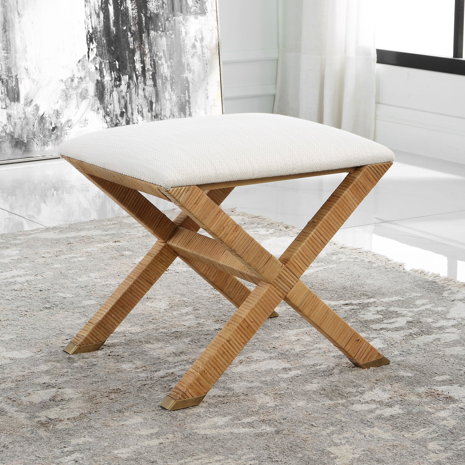 With Equal Parts Polished And Casual, The St. Tropez Bench Has Unlimited Styling Opportunities. The X-base Is Wrapped In A Natural Rattan With Antique Brass Foot Caps And Is Complemented By A Plush Upholstered Seat In A Crisp Textured White Polyester.