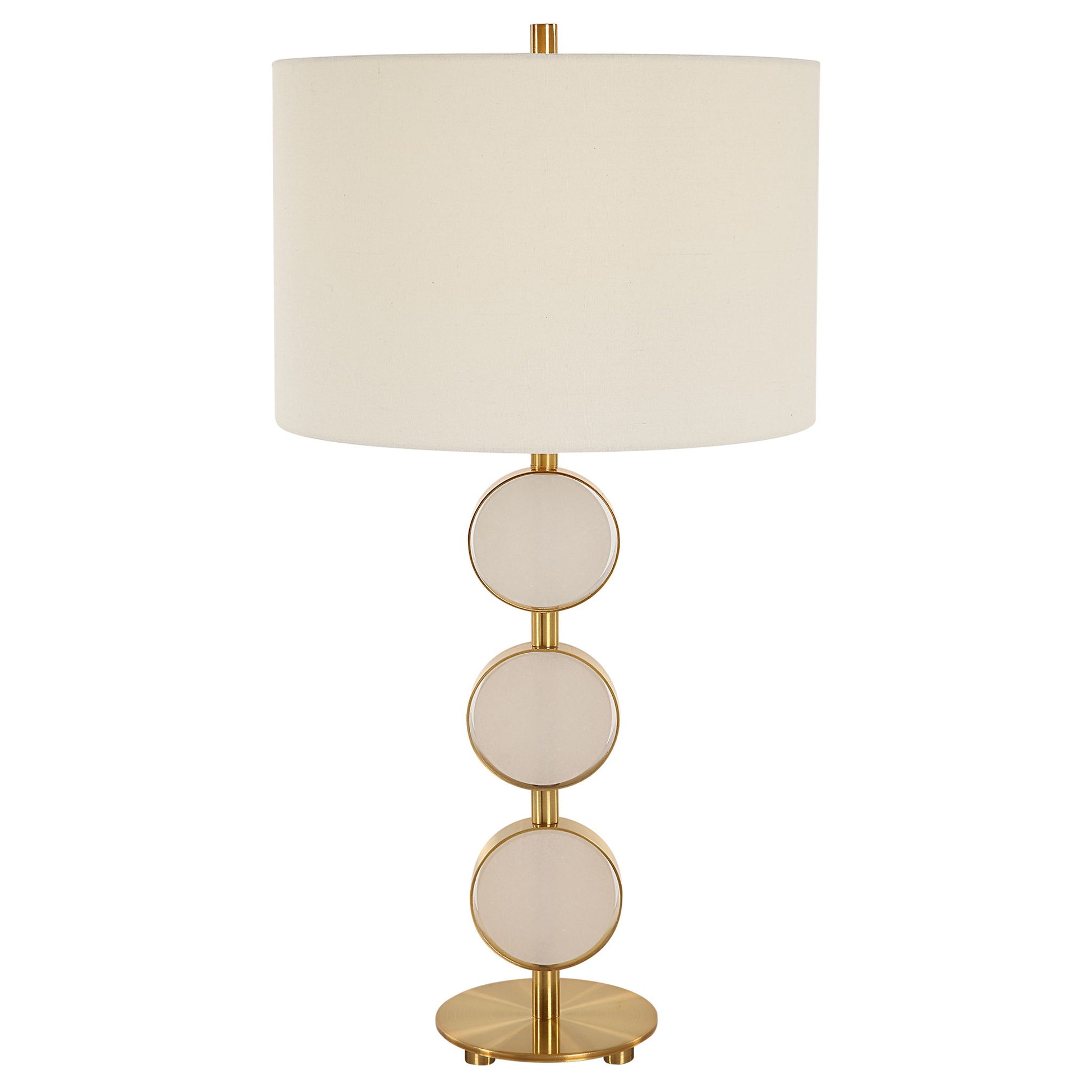 This Table Lamp Brings A Soft Contemporary Flair To Any Room By Featuring Three Suspended Alabaster Disk Surrounded By A Sleek Metal Base Finished In A Plated Brushed Brass. The Round Hardback Shade Is Covered In A Crisp White Linen Fabric.