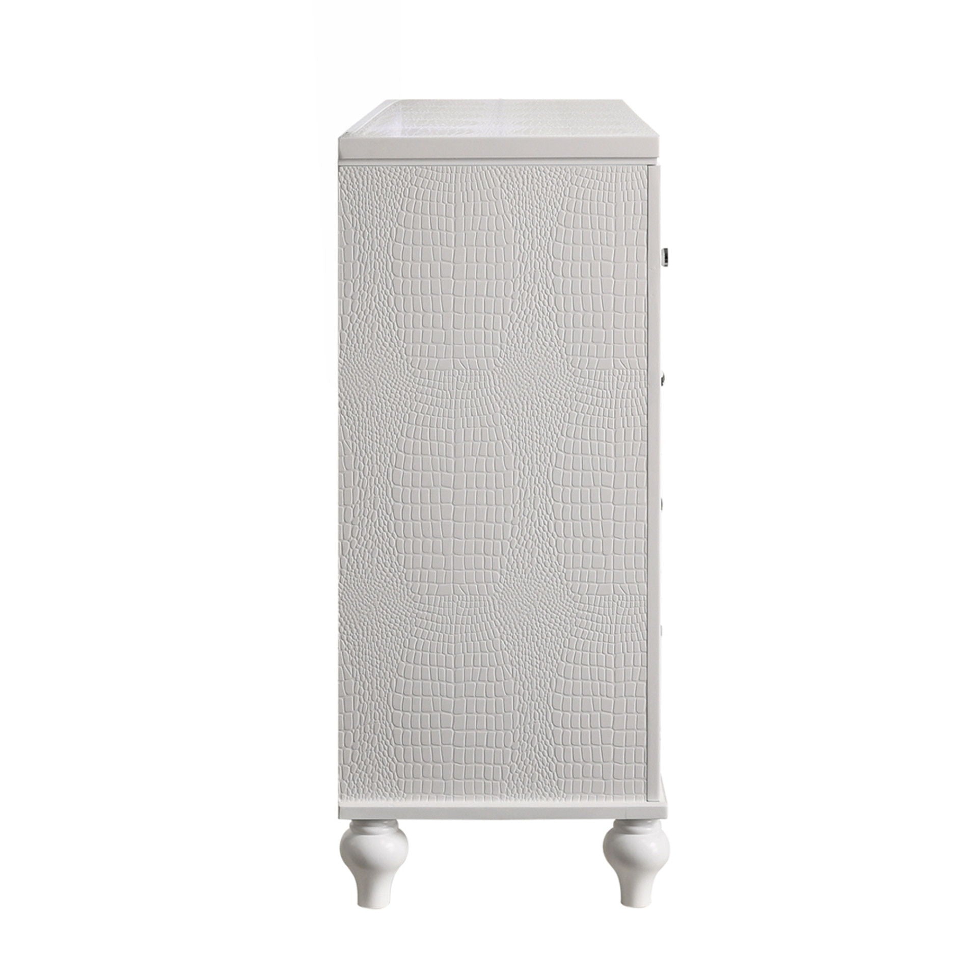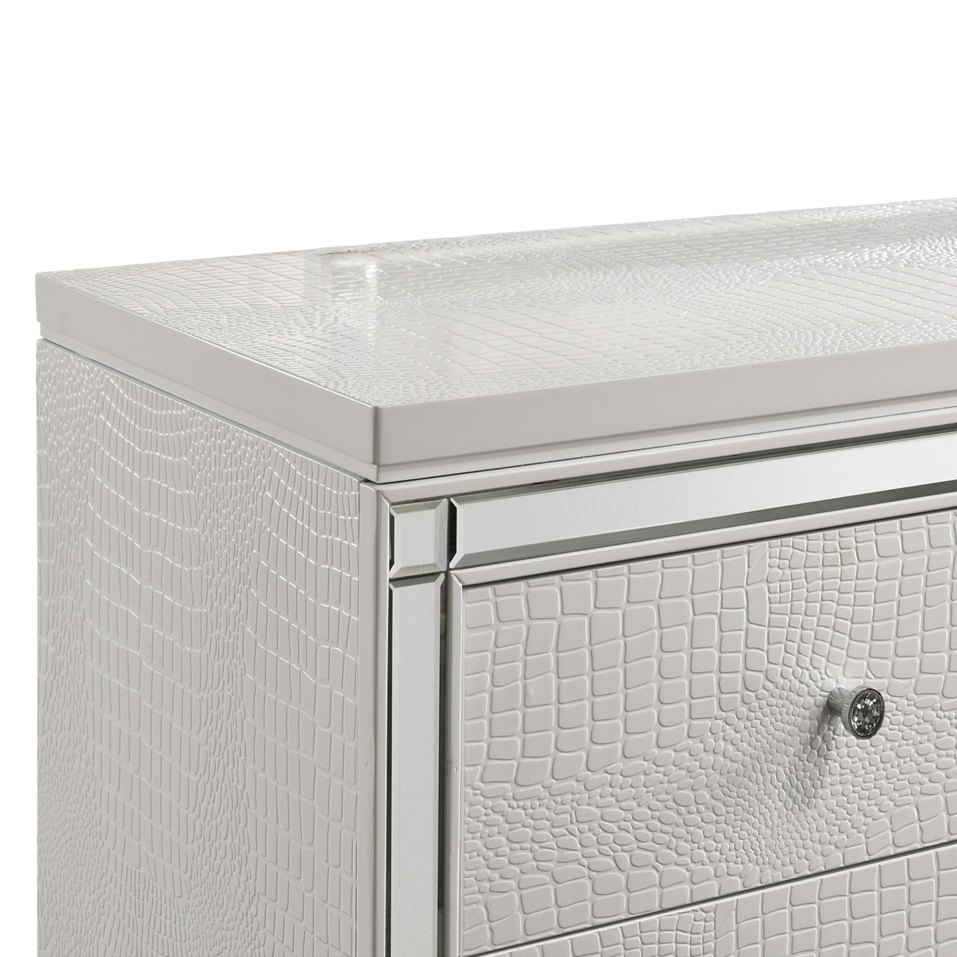 Discover the Valentino 9 Drawer Dresser—a marvel of durable craftsmanship crafted from a blend of manufactured and solid woods, adorned with exquisite embossed inlays. Radiating with glitz and glam, its gleaming finish, mirrored trims, crystal-studded drawer pulls, and alligator-embossed accents capture the essence of Hollywood allure. Delight in its thoughtful details, from heirloom-crafted English dovetailed drawers with snag-free interiors to smooth full-extension ball-bearing glides. With an abundance of storage, this dresser offers ample space to organize your clothing and belongings effortlessly. Experience luxury and functionality combined in this unparalleled piece of furniture.