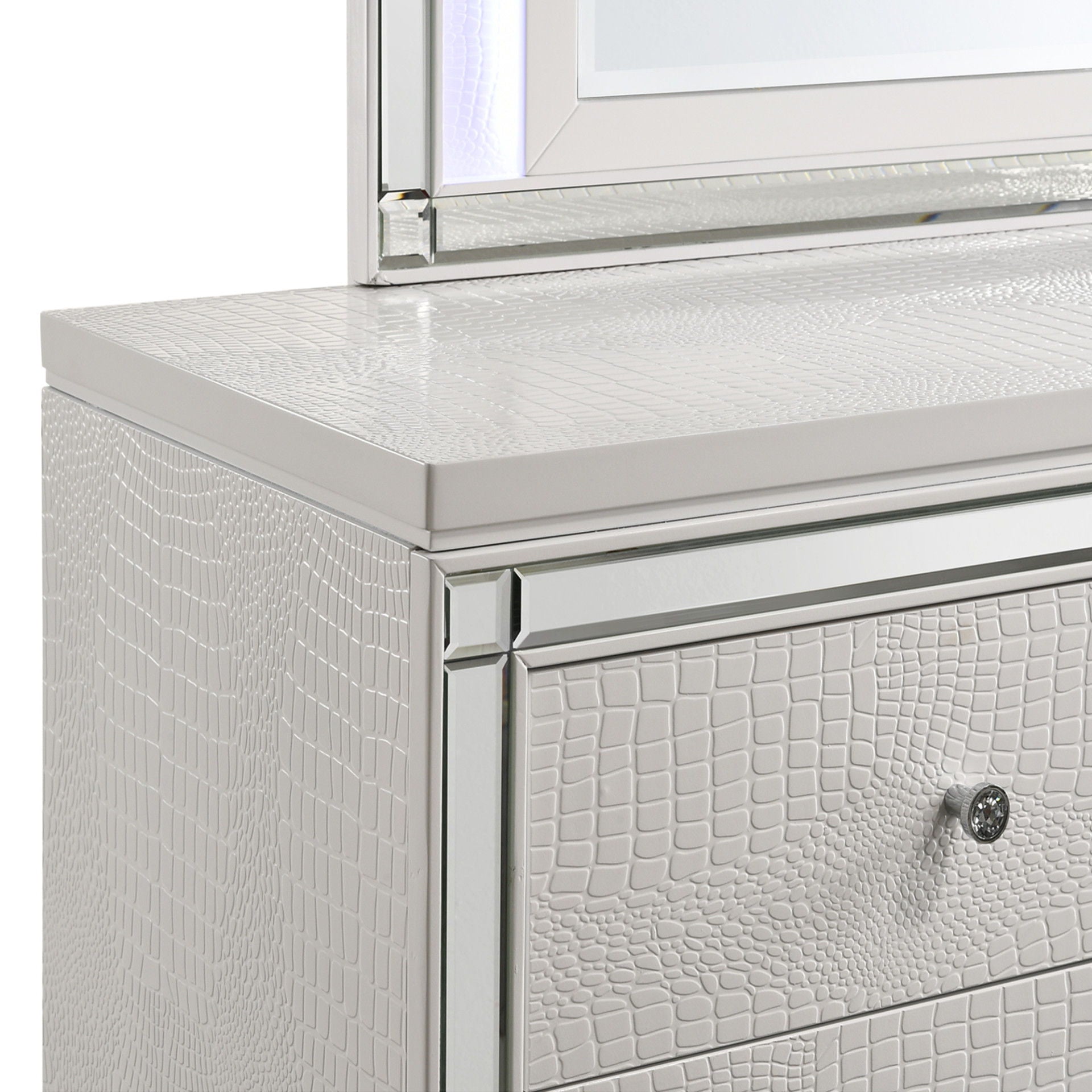 Introducing the Valentino Lighted Dresser Mirror—a testament to enduring craftsmanship crafted from a blend of manufactured and solid woods, accentuated by intricate embossed inlays. Revel in its glitz and glam, featuring a gleaming finish and mirrored trims that exude Hollywood allure. Elevate your space with its mood-enhancing soft LED lighting, casting a warm ambience for intimate moments. Experience the perfect fusion of durability, elegance, and functionality with this distinctive piece that promises to transform your dressing area into a sophisticated sanctuary.